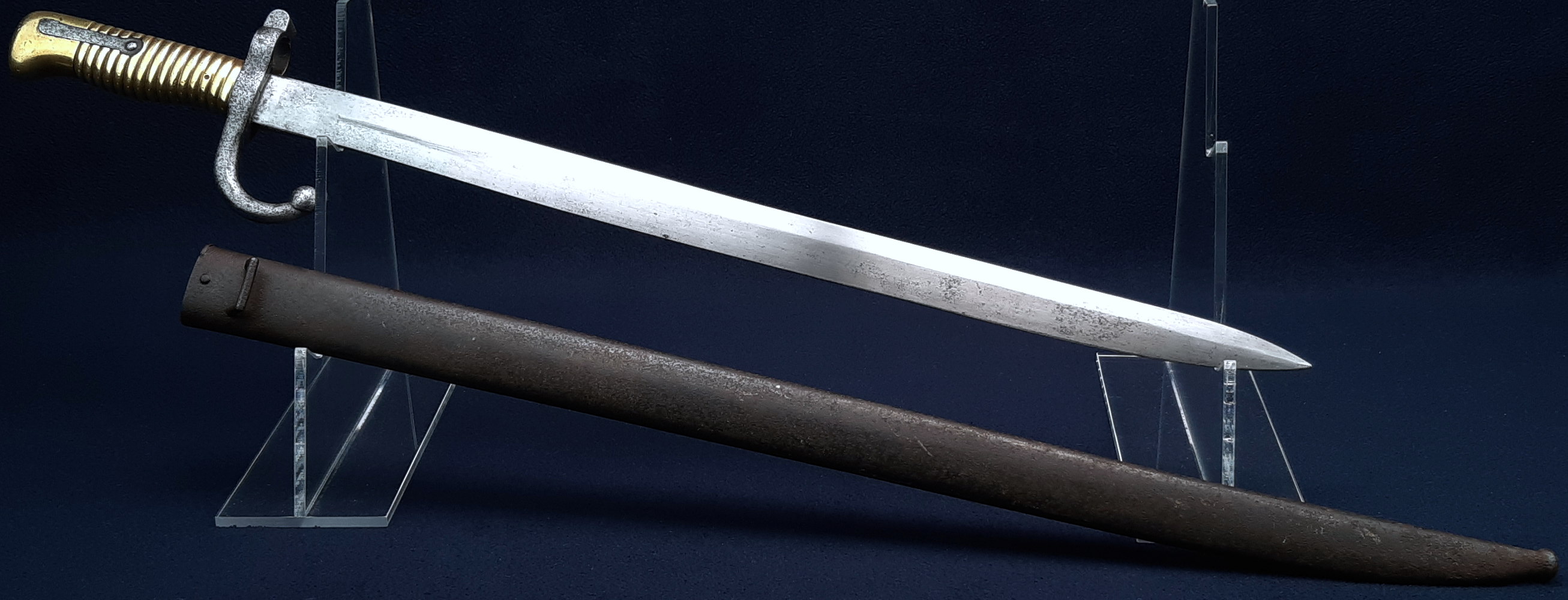 They are in many respects like the German ‘ersatz’ bayonets of WW1, including the use of repurposed materials: the French combined the hilt and grip of the M1866 Chassepot bayonet with blades of the much older M1816 and M1831 infantry sidearms, (both of ‘gladius’ style). These obsolete short swords were presumably seen as expendable sources of good blade steel, but they needed significant reshaping to make serviceable bayonets.