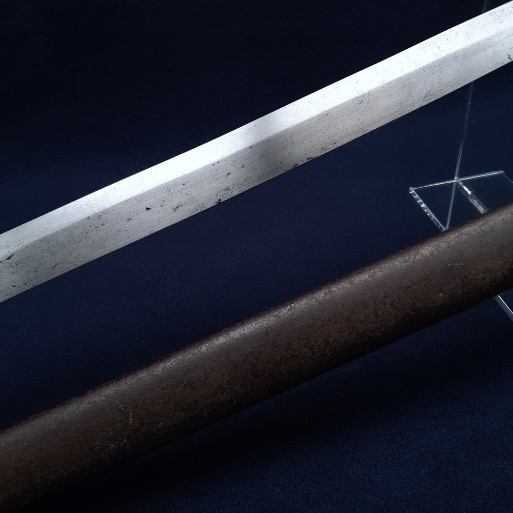 Straight unfullered blade with spear point, cross hilt with muzzle ring and hooked lower quillon with ball finial. Ribbed cast brass grip and beaked pommel, one steel rivet which also secures the external leaf spring which actuates the locking catch, peened tang at the pommel. Steel scabbard with frog loop. Blade length: 48.6cm (19 1/8 inches), overall length 61.1cm (~24 inches), muzzle ring diameter 18mm.