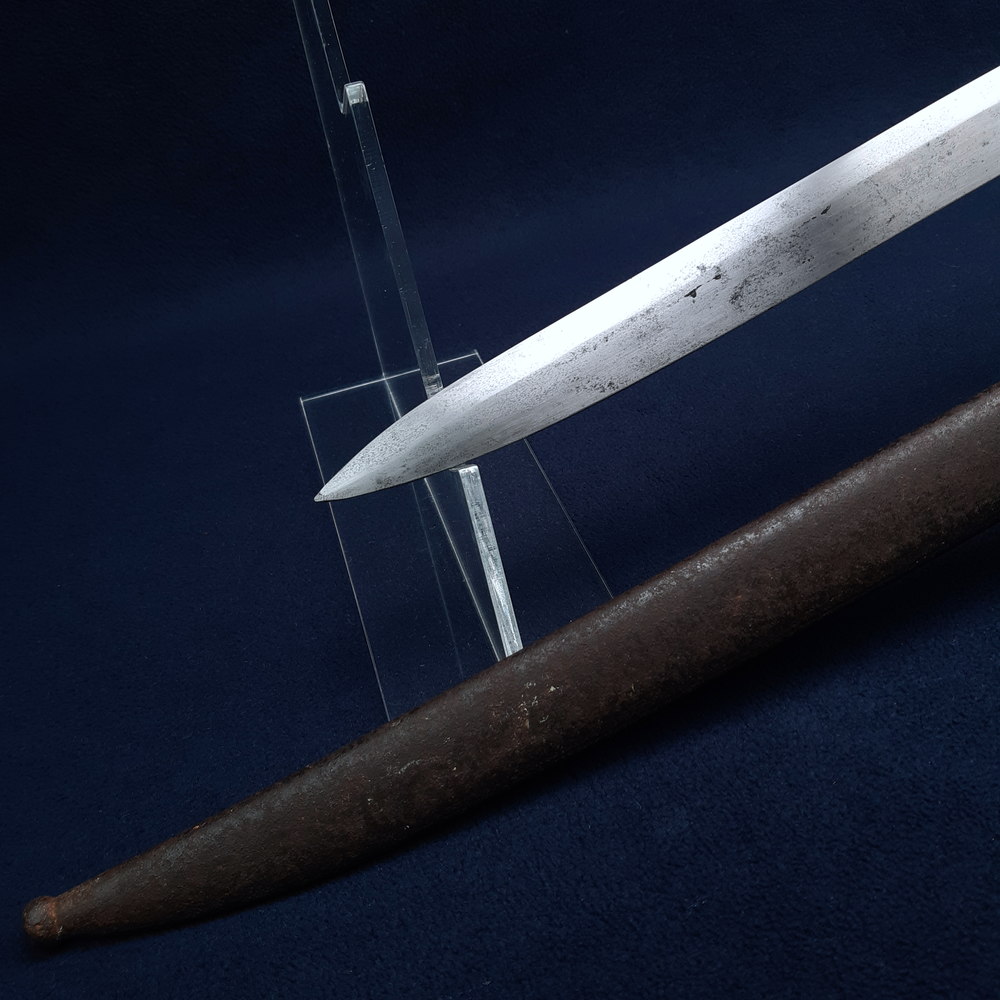 One edge of the double-edged, diamond profile blade has been ground down to form a flat spine and clear the way for the rifle to be fired. The blade was originally leaf-shaped broadening slightly along its length, and this is still visible in the remaining edge. The shoulder of the blade has been slimmed on both sides. With no fuller and no additional distal taper the blade remains noticeably heavy for a bayonet: a standard M1866 weighs 622g while this piece weighs 774g, despite being nearly 10cm (4in) shorter.