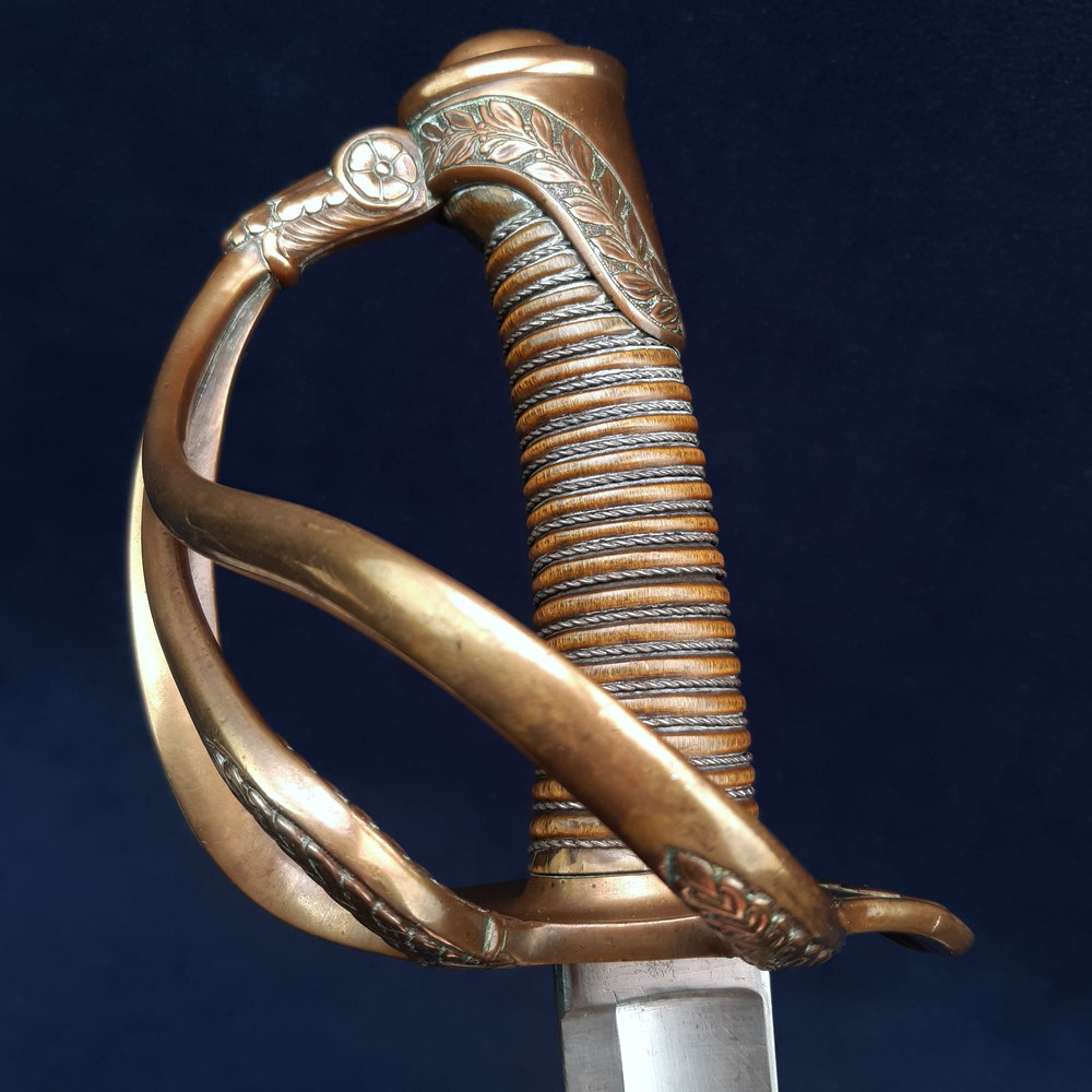 The inside of the guard is cast with a half fleur-de-lys atop a seven-branched palmette (‘Half’ because the bottom section of the flower form below the central band is omitted, this referred to in French as fleur-de-lis au pied coupé). There are also half fleur-de-lys motifs at the base of the decoration on each side bar, both inside and out. The fleur-de-lys was used on these swords from 1822 until 1831, so this sword is most likely an early example. The presence of two scabbard rings are also an early feature.