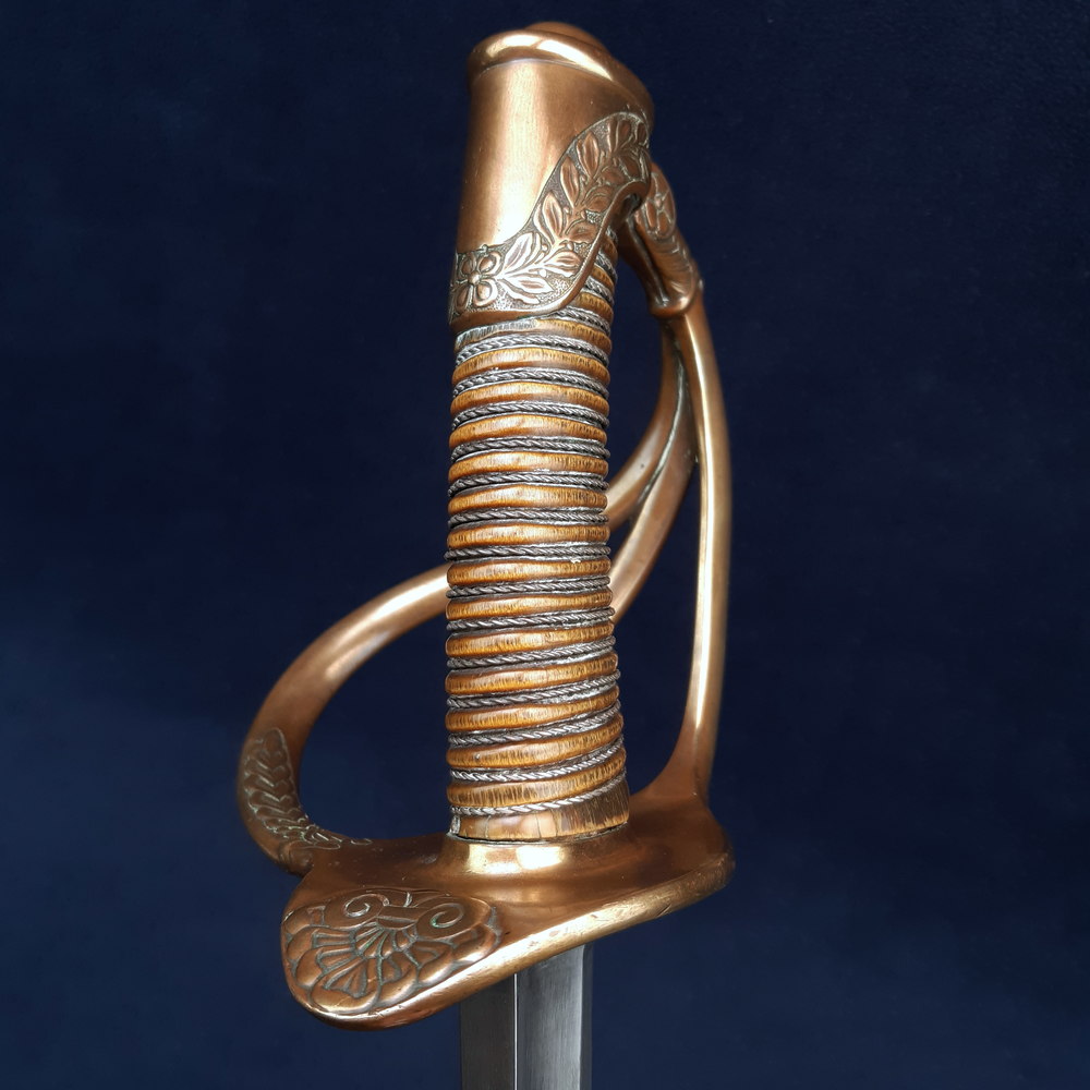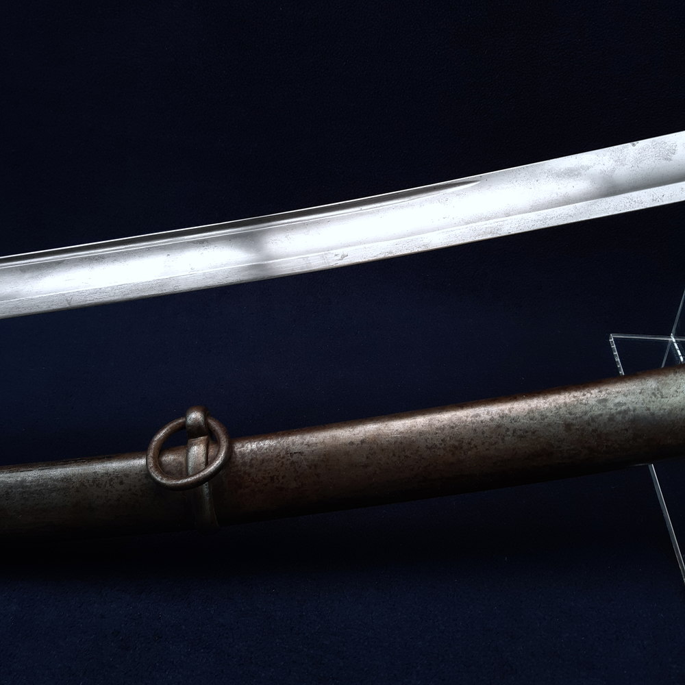 Curved blade fullered a la Montmorency (one narrow fuller running close to the spine, and a broader central fuller) with hatchet point. No leather washer. Brass three-bar hilt, the outer bars cast with ornamentation, brass oval pommel cap similarly decorated. Grip of brown horn, bound with wire. Steel scabbard with two bands with hanging rings. Blade 92cm (36.22 inches) in length, the sword 106.5cm (41.93 inches) overall.