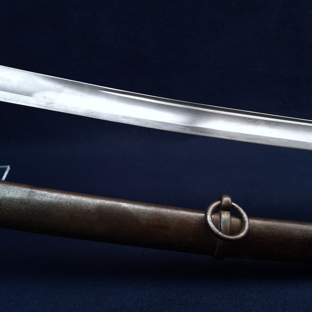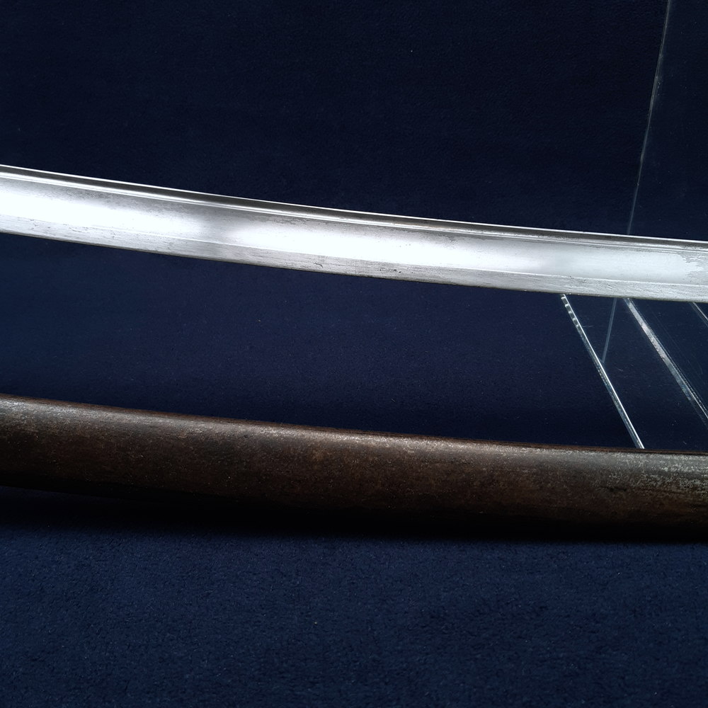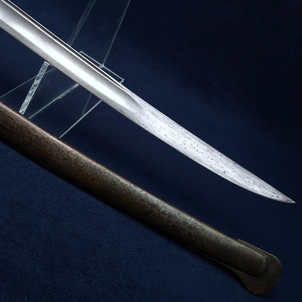 The scabbard is free of dents, with some light scratching in places. It is darkly patinated overall, mottled in areas and brighter on raised edges like the throat piece - I believe at least some scabbards for the M1822 were darkly finished to begin with, so this finish may have been worn down from uniformly dark rather than patinating from bright.