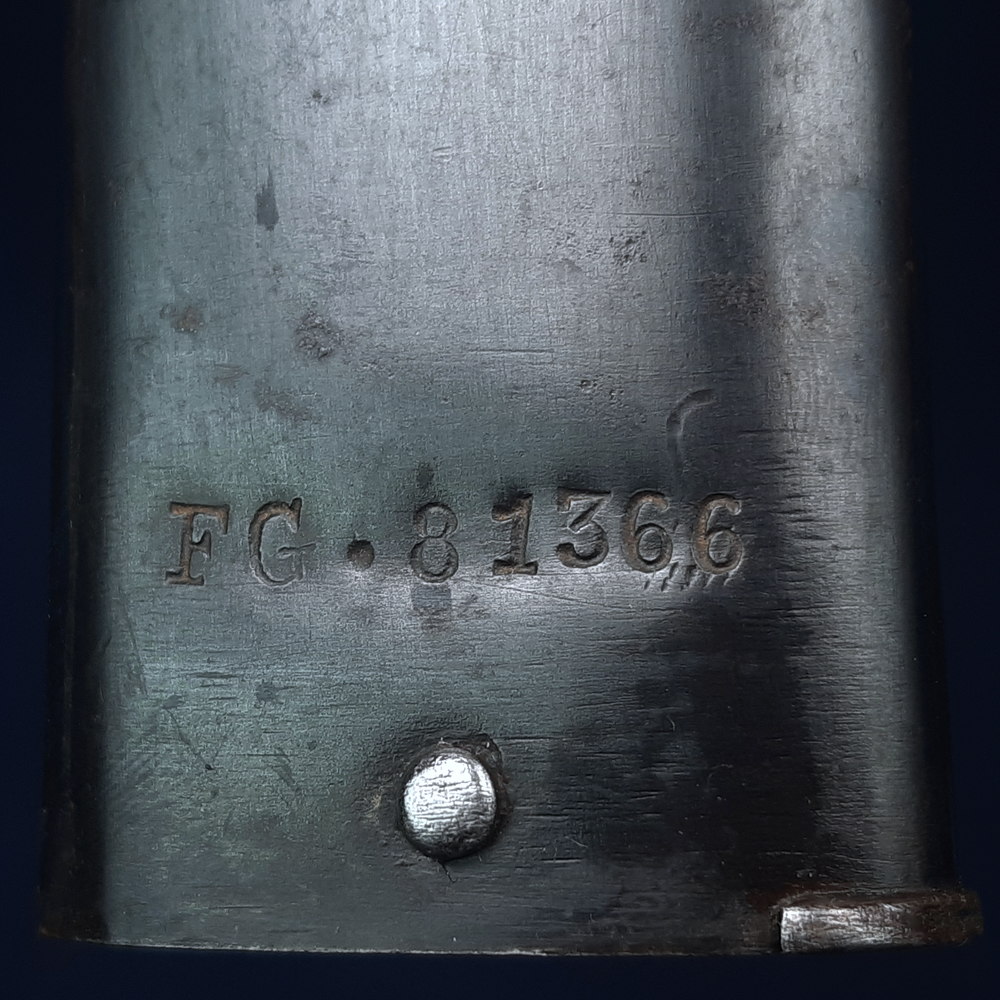 The spine of the blade is engraved in cursive script ‘St Etienne Mai 1871t, meaning it was made at the state arms factory at St Etienne in May 1871. The blade is stamped at the shoulder on one side with two French ‘poincon’ inspection stamps. The upper face of the hilt and the quillon are stamped with further poincons, along with the number ‘4’ and ‘248’. The hilt is stamped on one side with the serial number ‘J 70126’. The scabbard is stamped near the throat with the serial number ‘FG . 81366’, indicating a non-matching pair with the blade.