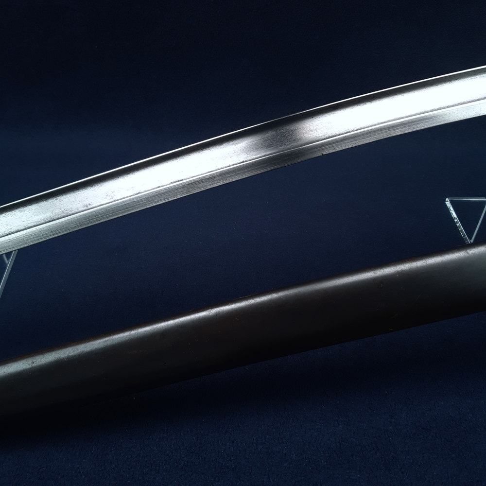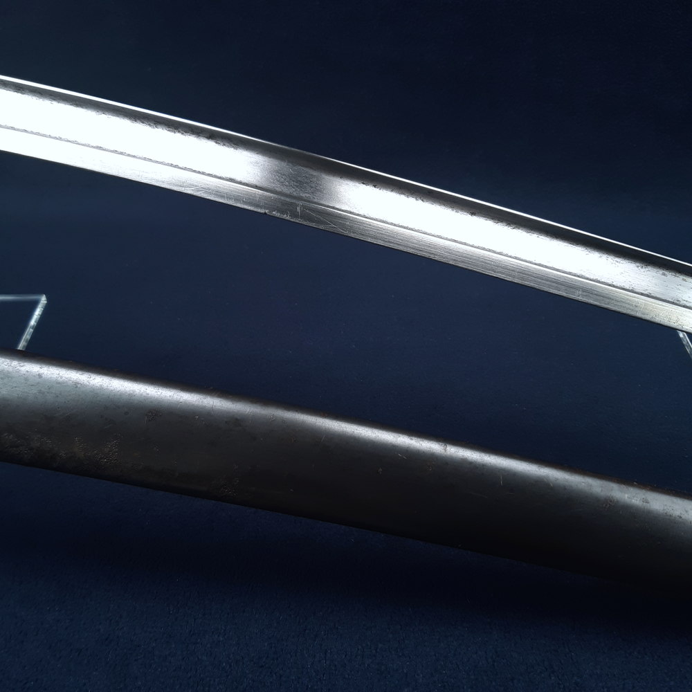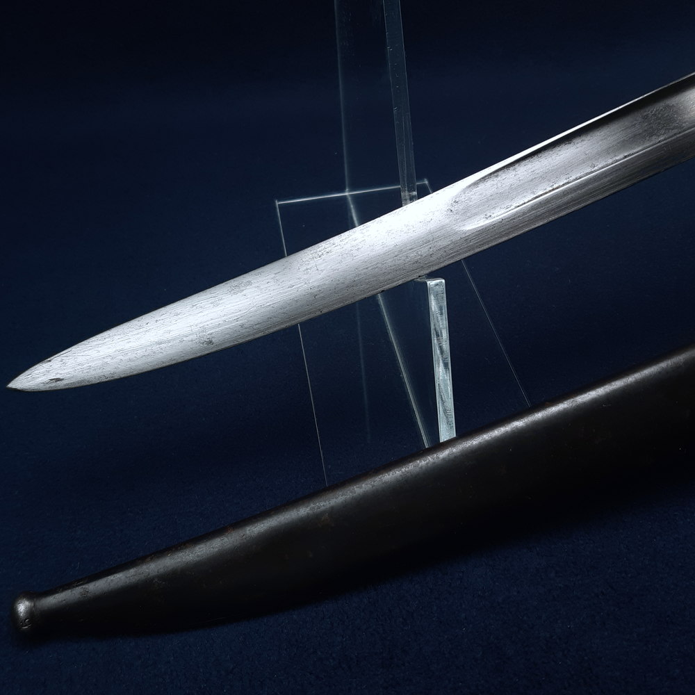 The blade is bright with some light spots of patination in the fullers and near the tip, some scratches to the edge bevel. A few small nicks to the edge, which is unsharpened. The hilt, steel parts in the grip and the scabbard have some light patination, the grip rivets and locking button are bright. The brass grip is lightly patinated with only a couple of tiny dents. The scabbard retains its original blueing with some spots of patination and a few small dents near the chape that do not interfere with sheathing and drawing.