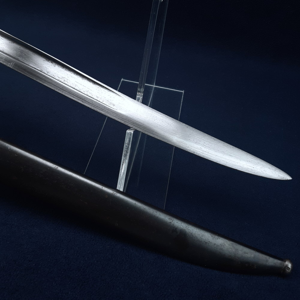 1871 was the first year of the new Third Republic, after the defeat of Napoleon III in the Franco-Prussian War of 1870 brought about his deposition as Emperor and the end of the Second French Empire, making this one of the first ‘republican’ marked bayonets. Its maker is marked simply as ‘St Etienne’, the plant shedding its old title of the ‘Manufacture Imperiale de St Etienne’.