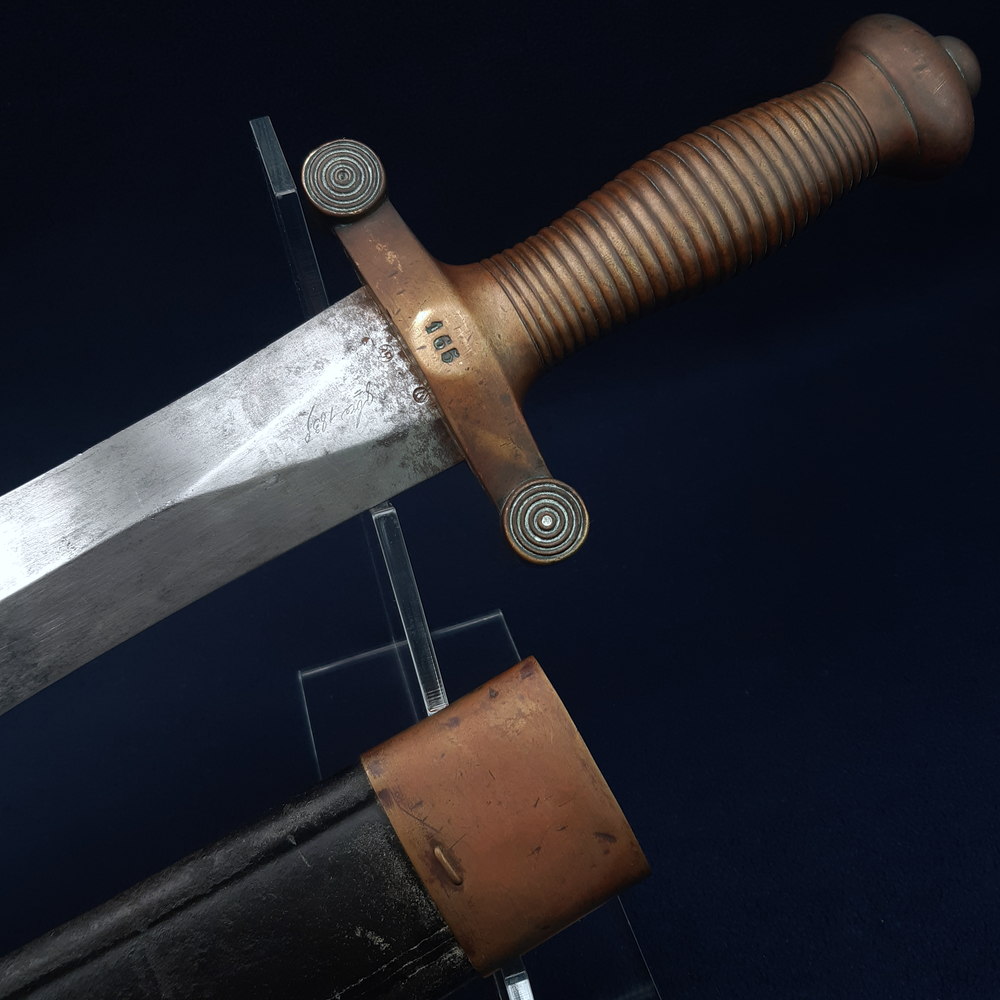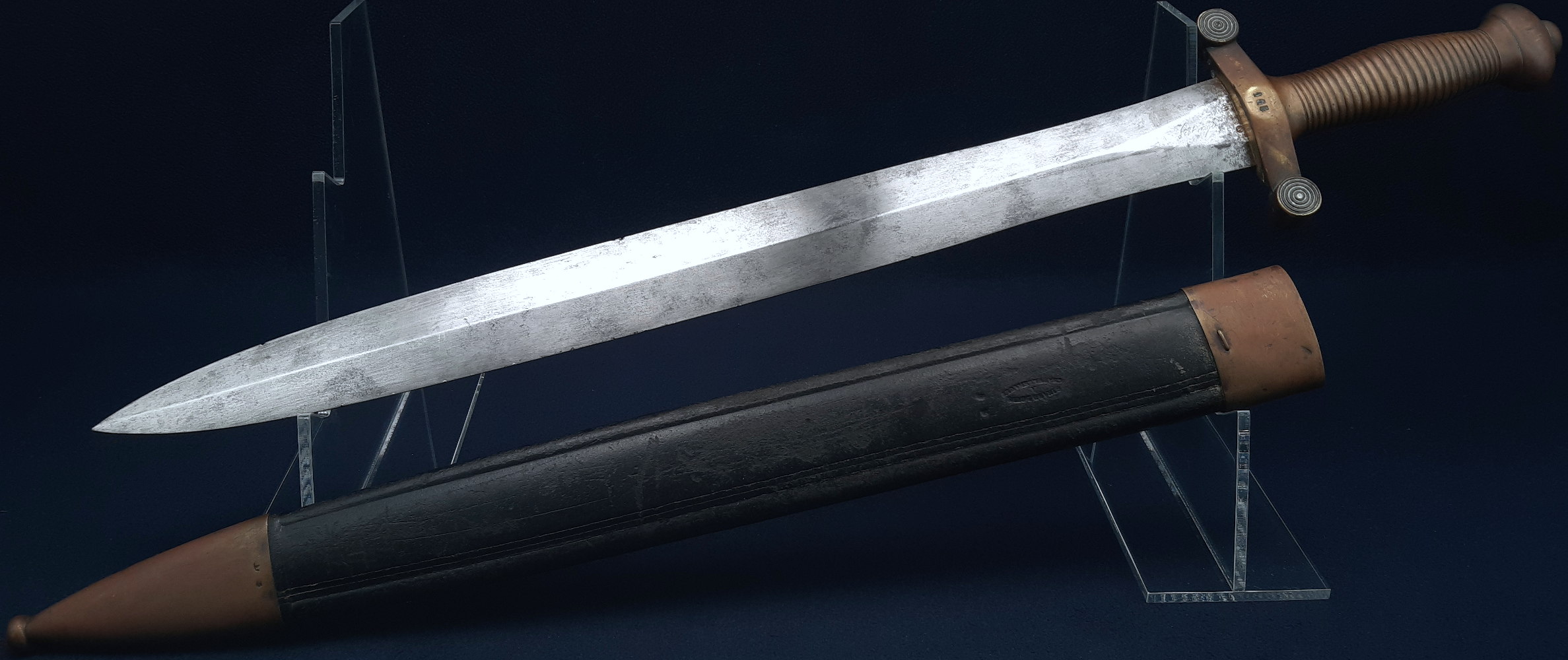Sidearms with the form of a neoclassical ‘gladius’ appear to have originated with the French 1771 ‘Eagle Head’ Artillery sword. A series of very similar-looking short swords were subsequently designed, including the French 1816 & 1831 Artillery models, the US Model 1832 Foot Artillery, the Swiss 1842 Pioneer’s, the Russian 1848 Pioneer’s and the British 1855 Land Transport. They were simple and robust but not particularly useful for combat (the gladius having become obsolete for good reasons) so remained either ceremonial items or in the role of a machete for various field tasks such as clearing brush.