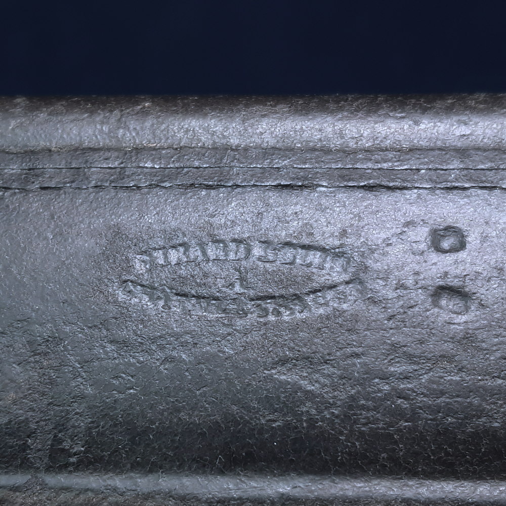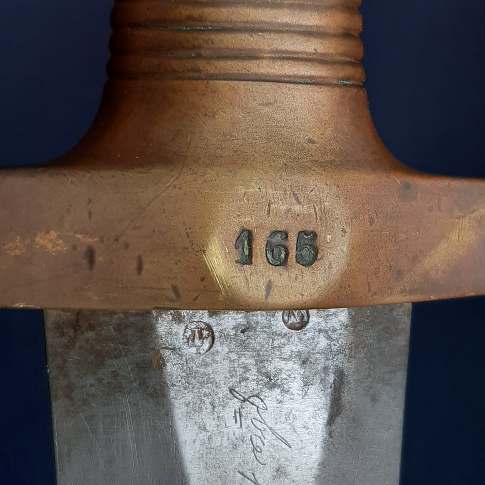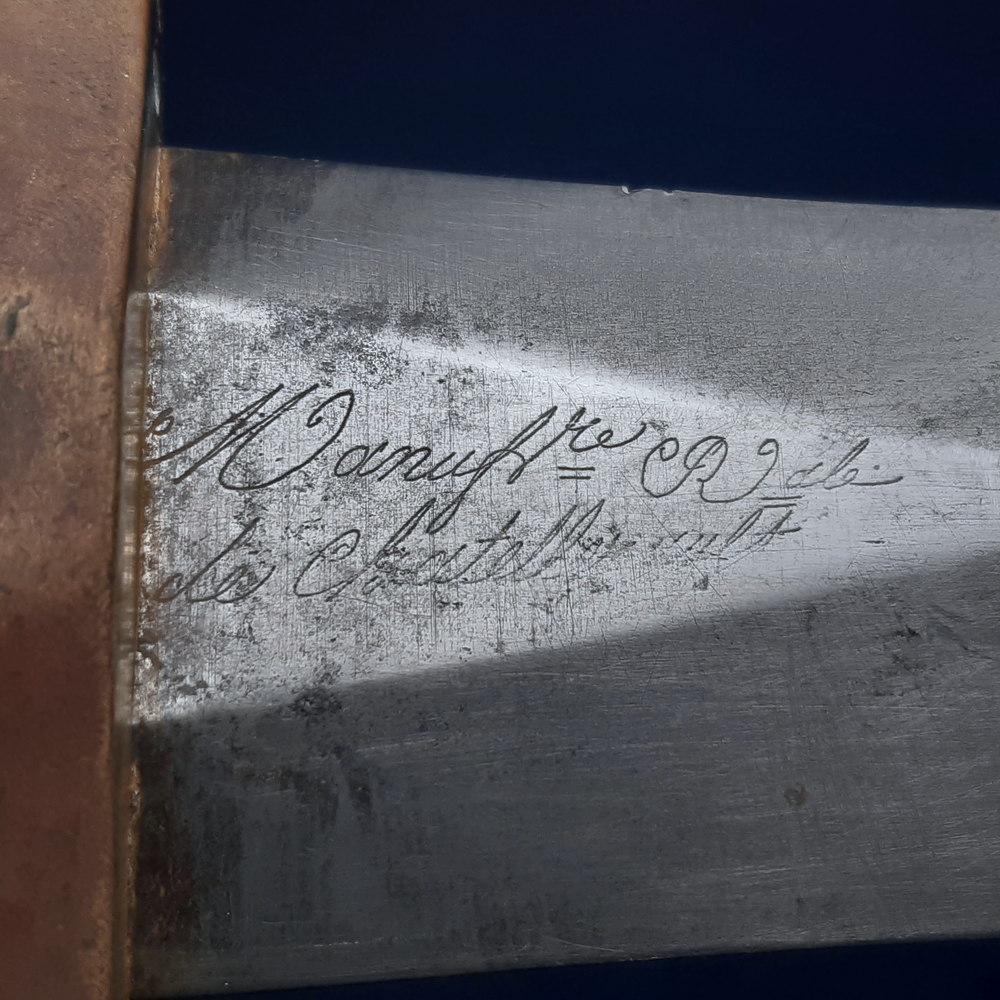 The blade is engraved on one side at the forte with the maker’s mark ‘Manufre Rale de Chatellerault’ (Manufacture Royale) and on the other side with ‘Fbre 1839’ next to which it is stamped with two French ‘poincon’ inspection stamps at the shoulder. The hilt is stamped on one side with the serial number ‘165’. The chape piece of the scabbard is faintly stamped with two poincons. The leather of the scabbard is stamped with the maker’s mark ‘GIRARD LOUIS A CHÂTELLERAULT’.