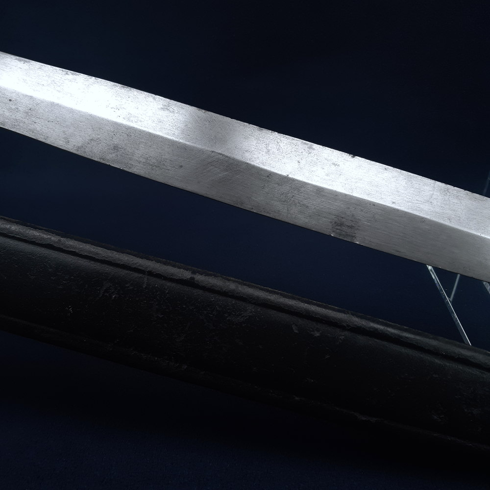 Straight double-edged blade, unfullered with diamond profile and spear point. One-piece cast brass hilt, grip and pommel, the hilt with circular finials, the grip ribbed, the pommel oval with a domed circular tang button. Black leather scabbard with brass throat and chape pieces, the throat piece with a frog loop, the leather section with two debossed lines lengthwise on the front face, similar on the reverse face but with one line being the stitching. Blade 48.8cm in length (just over 19 1/8 inches), the sword 63.9cm (just over 25 inches) overall.