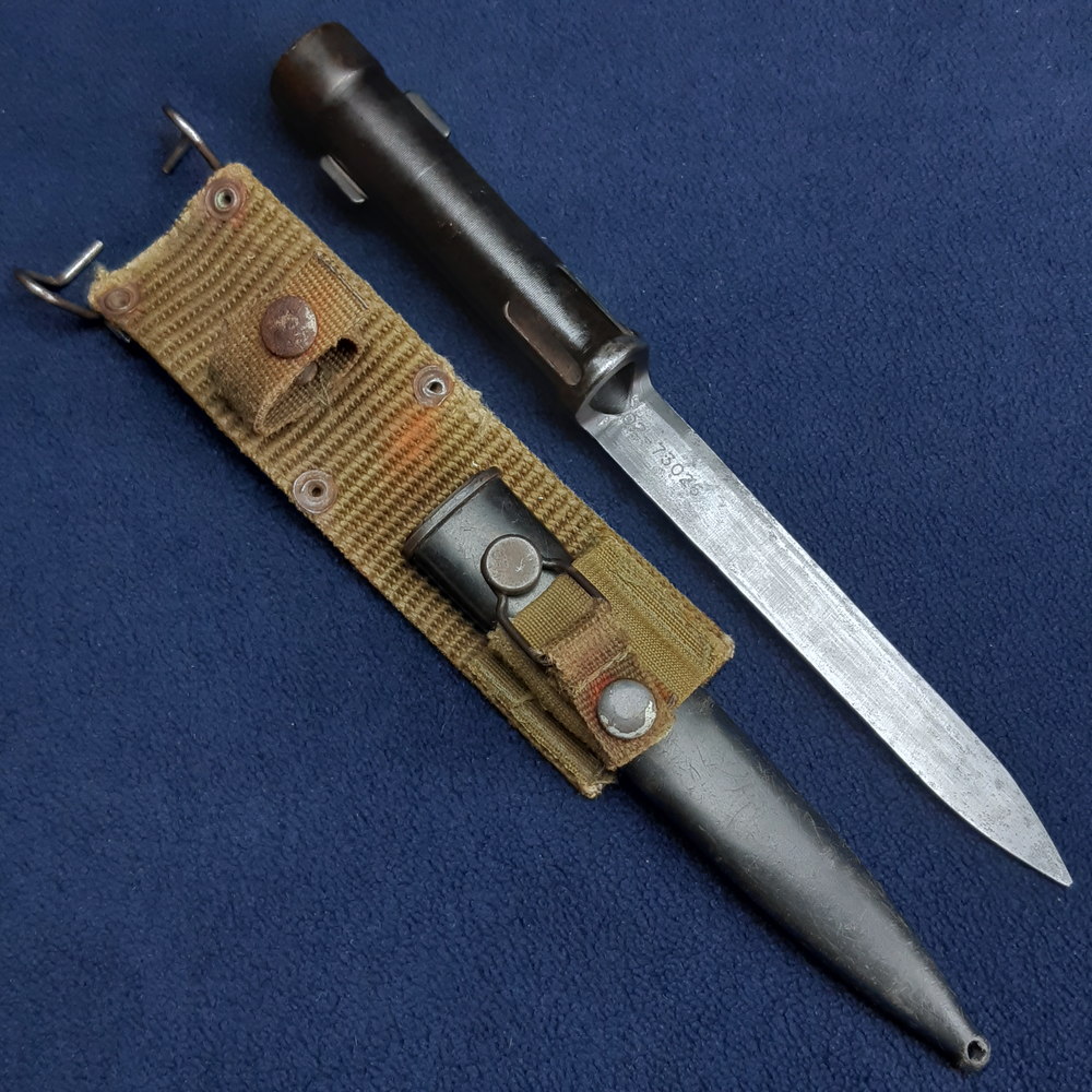 The bayonet has its original blued finish, with black paint on the release catch. Some minor rubbing to both these finishes on raised edges. The blade has some spots of patination, a few light dents to the blunt ‘edge’ of the blade on one side. The tip of the blade has rolled (<1mm). Bright lines to the blade where it rubs against the scabbard on sheathing. Light scratching to the plastic scabbard body and one broad, shallow dent on its front face which does not interfere with sheathing and drawing. Rubbing and dark patination on the frog rivets, some dirt and spots of very light surface fraying to its canvas. One half of the black plastic belt grip on the frog has been lost, a small piece remaining in place under a rivet. The other half has some scratching to the plastic. The wire belt hook is slightly bent. It swings freely with no rust.