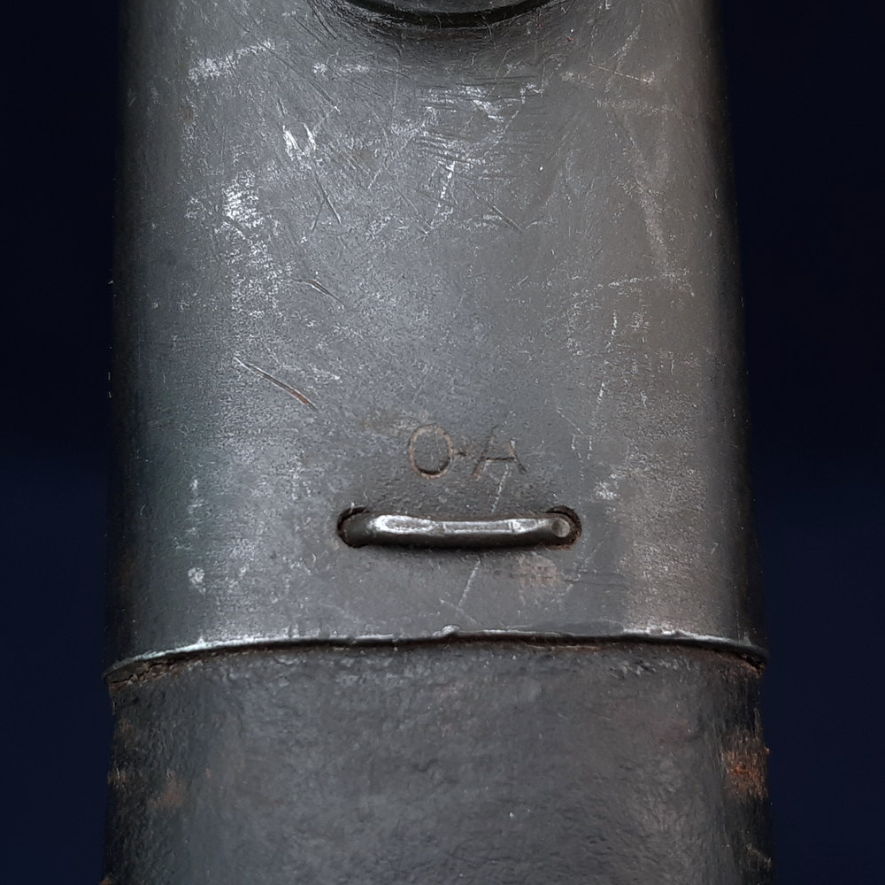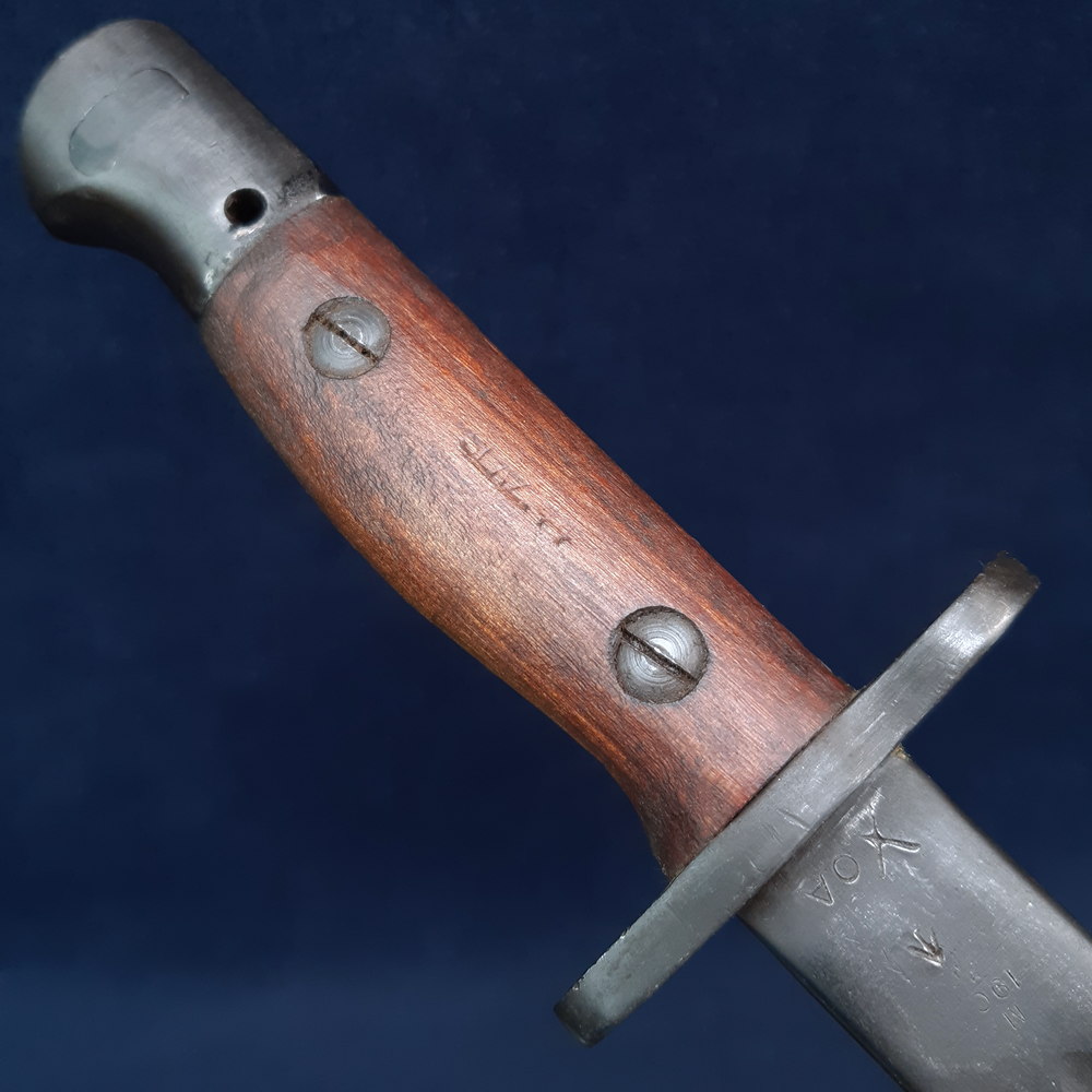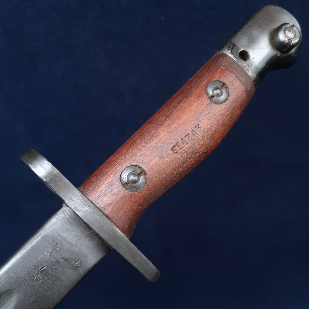 The ricasso is stamped on one side with ‘MA’ for Munitions Australia, over ‘1907’, the model, over ‘1’, as well as a broad arrow War Department mark, the manufacturer’s mark ‘OA’ indicating the Orange Arsenal, and an ‘X’ indicating that it passed a manufacturer’s bending test. On the other side it is stamped with another ‘MA 1907 1’ mark and the manufacture date 4 ’44 indicating April 1944. One of the wood grips is stamped between the screws with ‘SLAZ 43’ and the other with ‘SLAZ 44’, indicating that they were produced in 1943 and 1944 by the Slazenger company, better known for its sporting equipment.