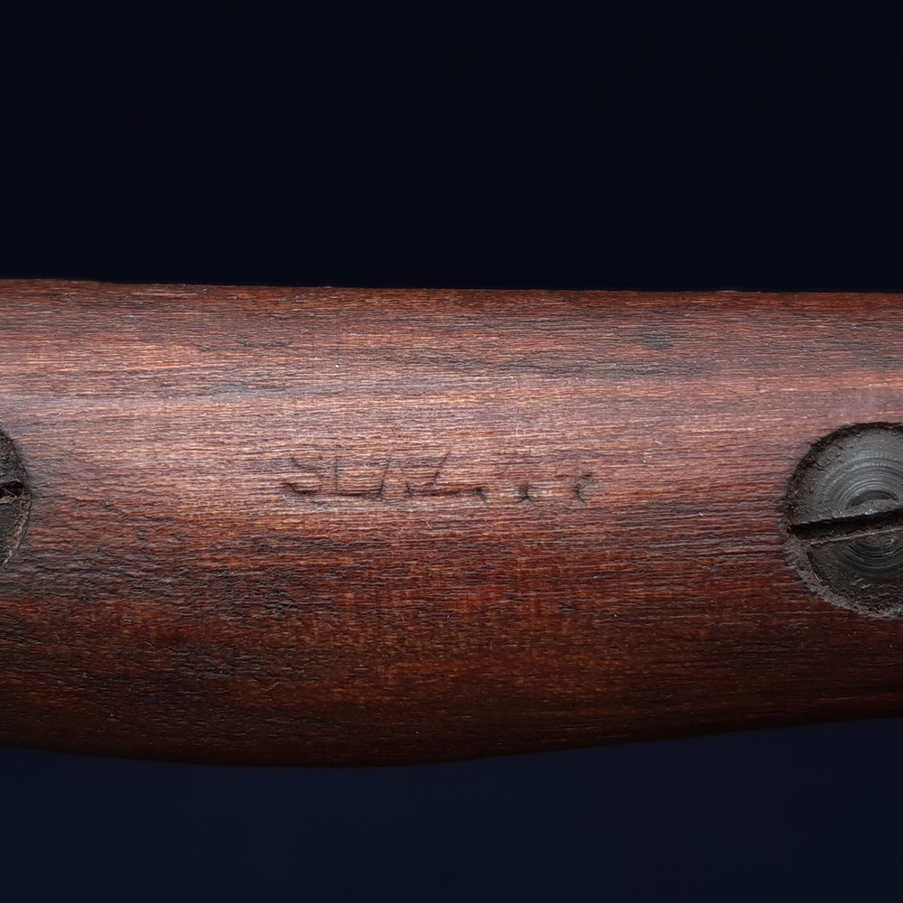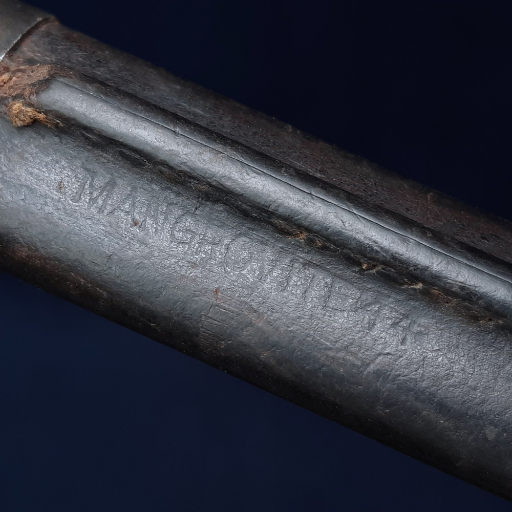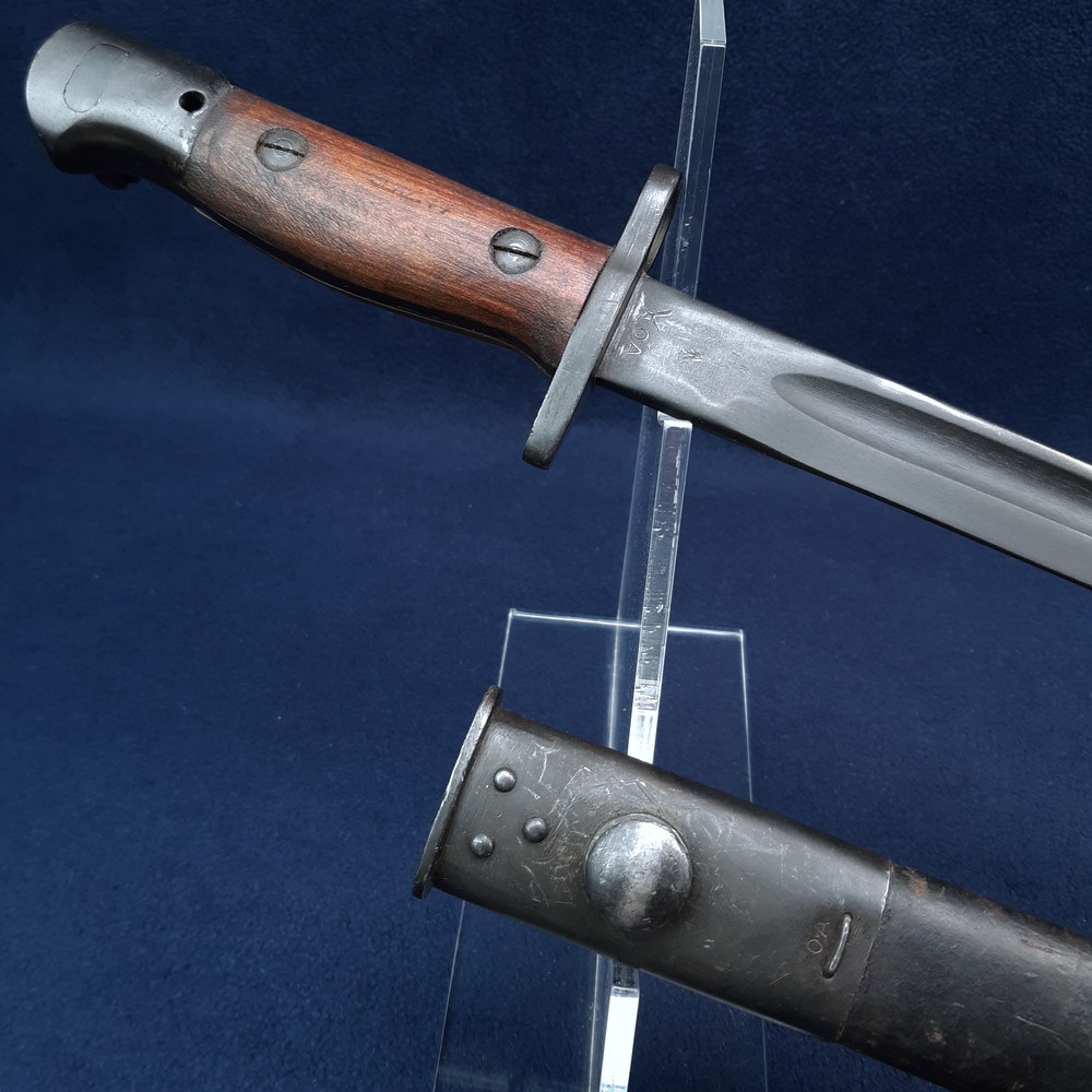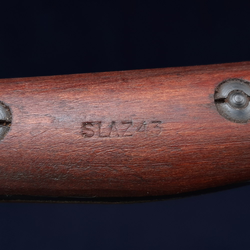 The ricasso is stamped on one side with ‘MA’ for Munitions Australia, over ‘1907’, the model, over ‘1’, as well as a broad arrow War Department mark, the manufacturer’s mark ‘OA’ indicating the Orange Arsenal, and an ‘X’ indicating that it passed a manufacturer’s bending test. On the other side it is stamped with another ‘MA 1907 1’ mark and the manufacture date 4 ’44 indicating April 1944. One of the wood grips is stamped between the screws with ‘SLAZ 43’ and the other with ‘SLAZ 44’, indicating that they were produced in 1943 and 1944 by the Slazenger company, better known for its sporting equipment.