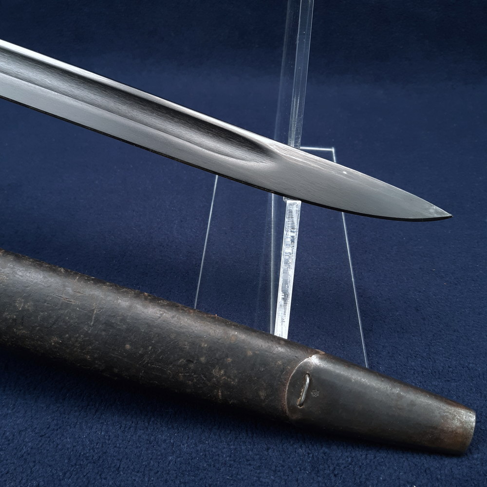 The blade has an even dark parkerised finish with some wear only along the spine from rubbing upon sheathing and drawing, exposing bright steel. The hilt, exposed tang and pommel likewise are darkly parkerised. The grips have some abrasion next to the pommel – possibly deliberately shaved down to better fit it to the pommel – and are otherwise excellent. The throat piece of the scabbard has some light scratches showing bright steel and some rubbing to the finish on the frog stud, likewise some rubbing to the tip of the chape piece. The leather of the scabbard has some light denting and surface rubbing.