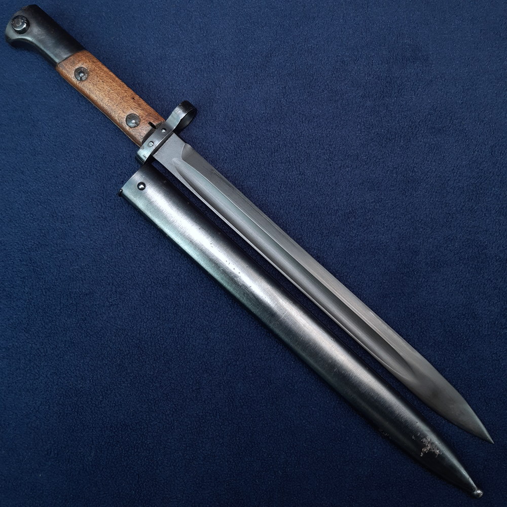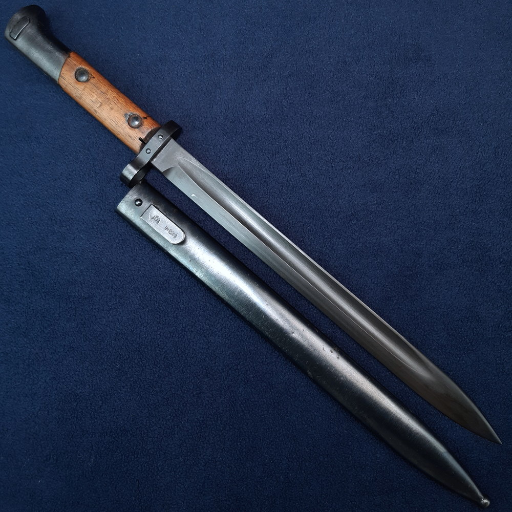 The M1924, or VZ 24, was the first bayonet adopted by Czechoslovakia after its independence from the Austro-Hungarian Empire in 1918. It fits the vz. 24 rifle, which was a derivative of the M1898 Mauser rifle that could be chambered in multiple calibres depending on customer demand. These rifles and their bayonets were widely exported, notably to South American countries: Bolivia, Paraguay, Uruguay, Colombia, Venezuela, Guatemala, El Salvador, Brazil, Peru, Nicaragua and Ecuador were all users, and it was found on both sides of South American conflicts of the 1920s and ‘30s such as the Chaco War and Ecuadorian–Peruvian War. During the Spanish Civil War Catalan Republican forces were supplied with vz. 24s purchased by the Soviets. Chinese Nationalist forces purchased 195,000 over the course of a decade (1927-1937), used during the Second Sino-Japanese War and the Chinese Civil War. Iran placed multiple orders and also produced a version under license.