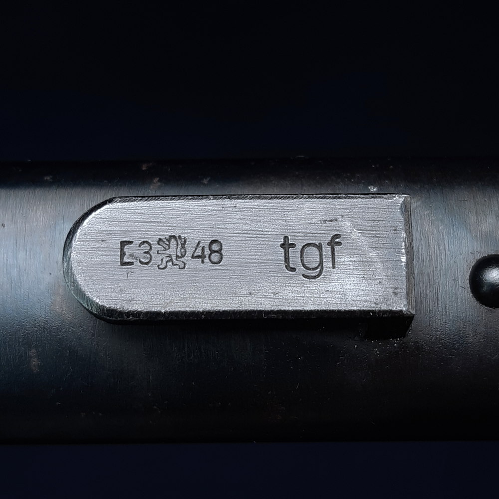 The blade is stamped on its exposed tang with a three-part stamp ‘E95’, followed by a crossed swords emblem, followed by ‘50’, indicating the year of manufacture was 1950. The pommel end is stamped with ‘112’ and ‘tgf’. The letter code ‘tgf’ was used to indicate Československá Zbrojovka, the state arms factory in Brno, during the Communist period. The scabbard frog hook is stamped with a similar three-part date stamp of ‘E3’ followed by a lion emblem followed by ‘48’ for 1948, and next to this with another ‘tgf’.