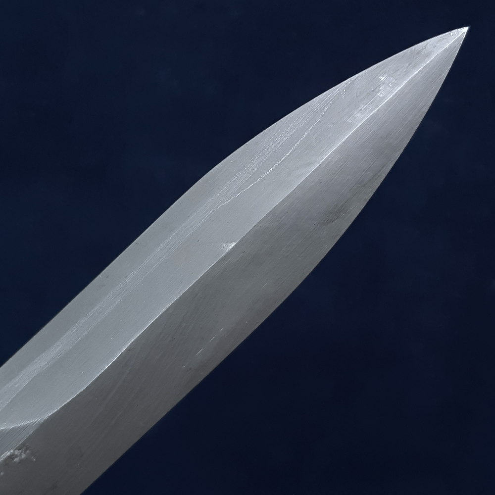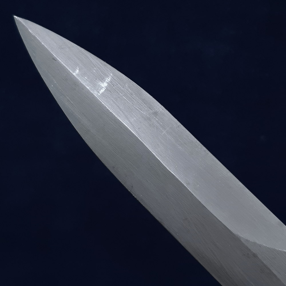 These bayonets were manufactured in South Africa by ARMSCOR or one of its contractors during the 1960s, using spare blades originally made by FN Herstal for the Uzi submachine gun: unfullered with a spear point and diamond profile.