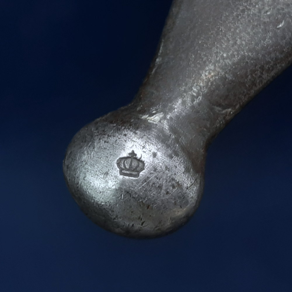 The blade is stamped at the ricasso with the maker’s mark ‘EJAB’ with an anchor impaling the letter ‘E’, indicating the manufacturer Eskilstuna Jernmanufactur AB (Eskilstuna Iron Manufacturing, Inc). This was a private tool & cutlery manufacturer which produced bayonets for the Swedish military, based in the industrial city of Eskilstuna which also housed a state arsenal. The locking button, tang of the blade and finial of the scabbard are all stamped with a crown inspection mark.