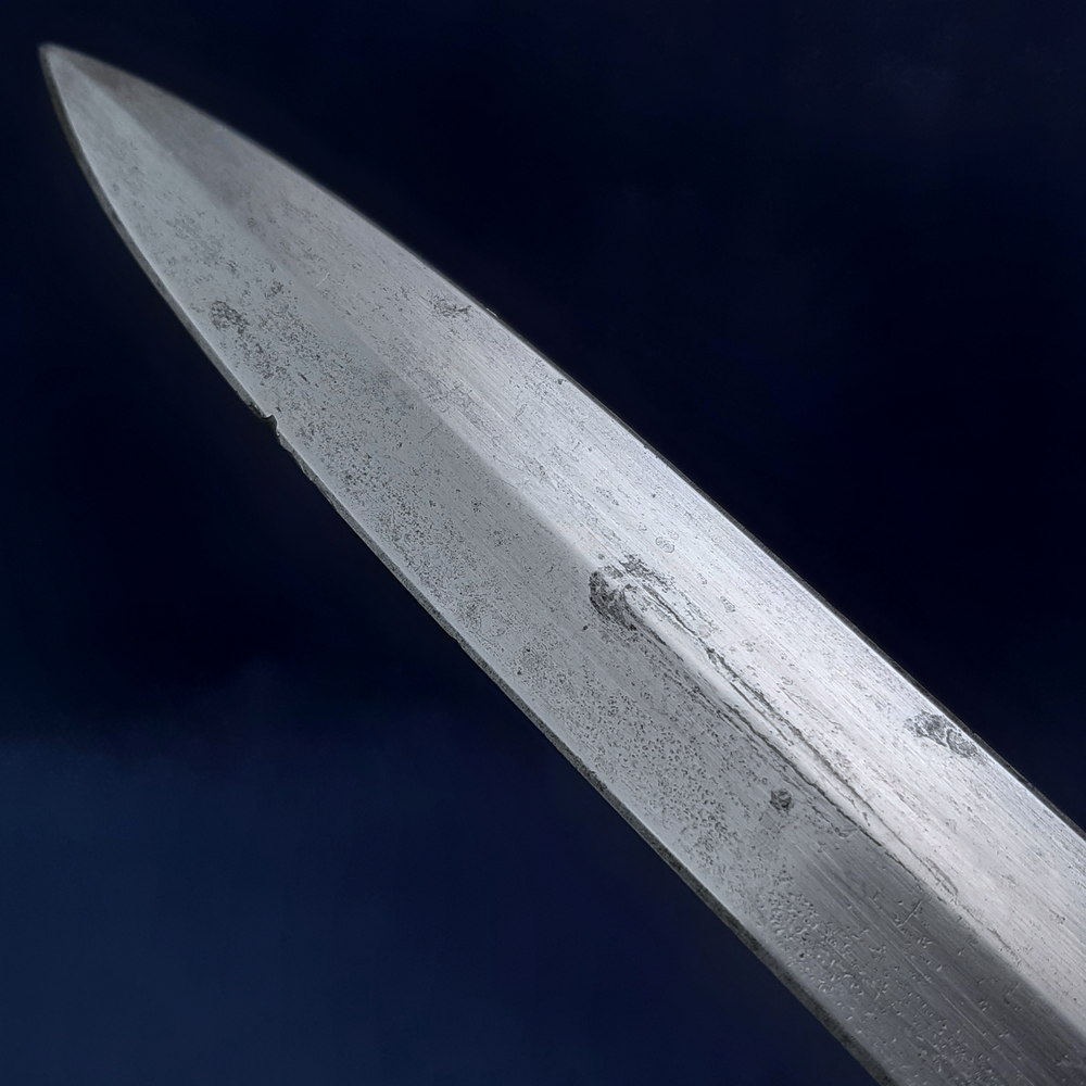 The blade is bright with some light frosting and some small spots of patination, retaining its blued band at the ricasso. The scabbard, hilt and pommel retain most of their blued finish, with rubbing on raised edges revealing bright steel. The wood scale grips are good with a few small dents and a short scratch on one side. The locking mechanism is fully functional and the bayonet sheaths and draws smoothly.
