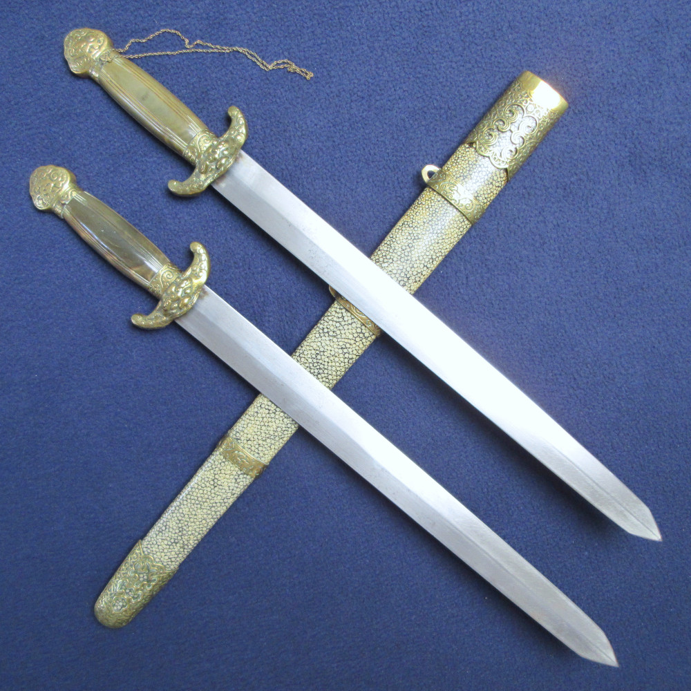 Two straight, spear-pointed blades with flattened diamond cross-section, each with cast brass hilt and pommel, horn grips, both fitting together into a wooden scabbard covered with smoothed rayskin, with five cast brass fittings, two with fixed hanging rings. A fine brass chain is attached to a loop on the pommel of one of the swords, the other pommel has the same loop but no attached chain. Blade length 16.5 inches, overall length of each sword 22 inches.