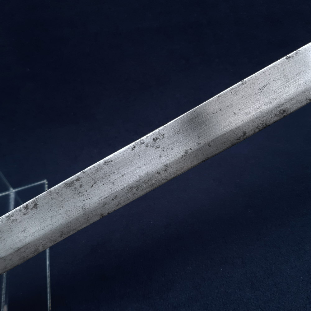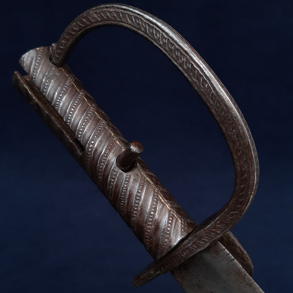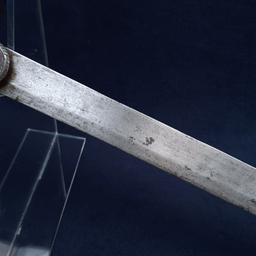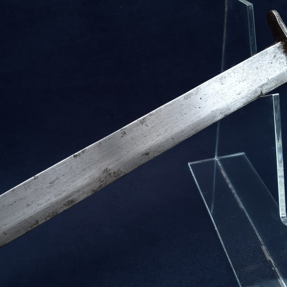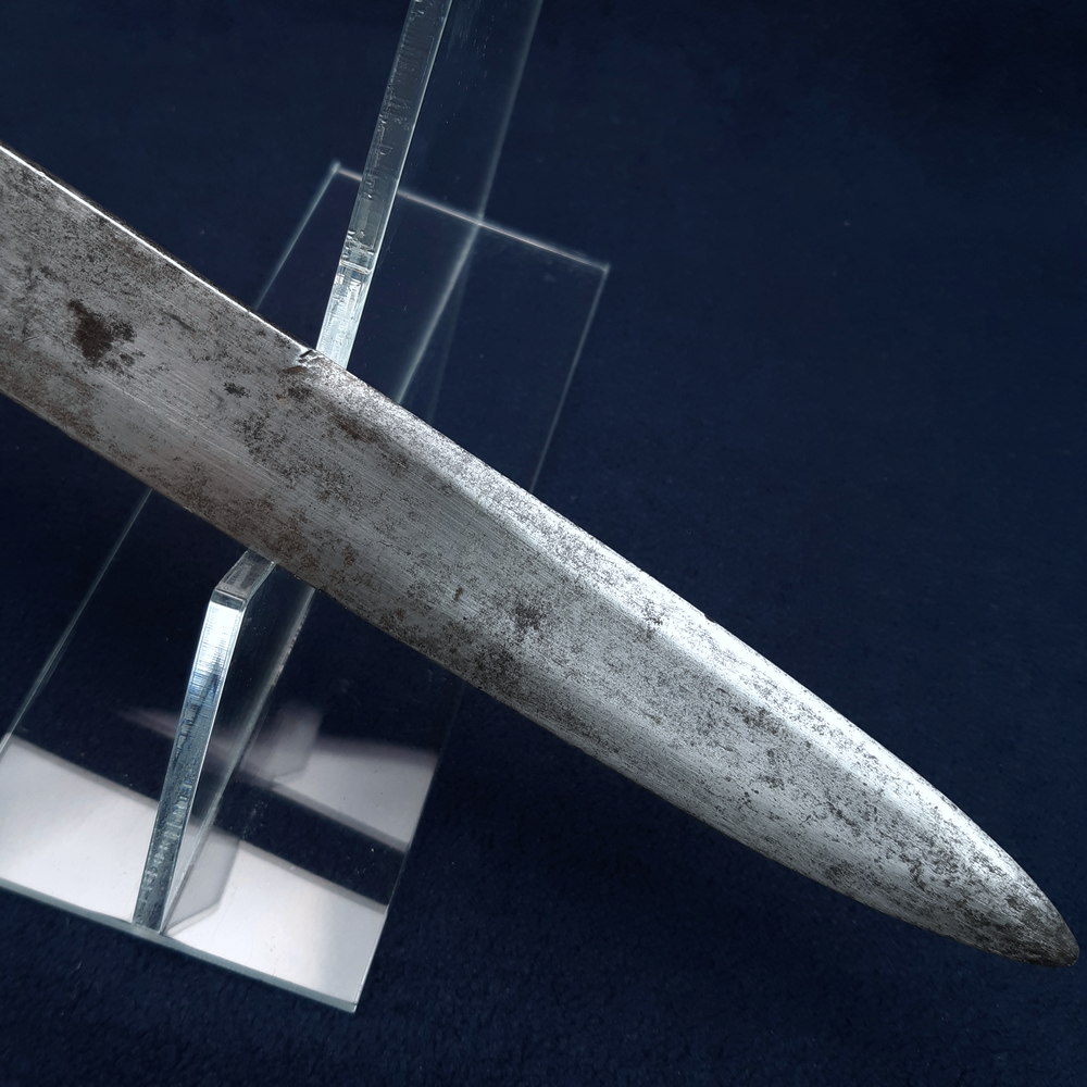 The locking mechanism functions, although I have not tested whether it will fit to a Brunswick. The blade has some forging imperfections, light scratching and some small spots of patination and light cleaned pitting in places, particularly towards the tip, which is rounded by ~3mm. A number of tiny nicks to both edges, one small notch to the true edge. The hilt has a dark forged finish with light rubbing wear to raised edges showing bright steel. The blade is solidly peened to the grip, slight movement to the knucklebow & langet.