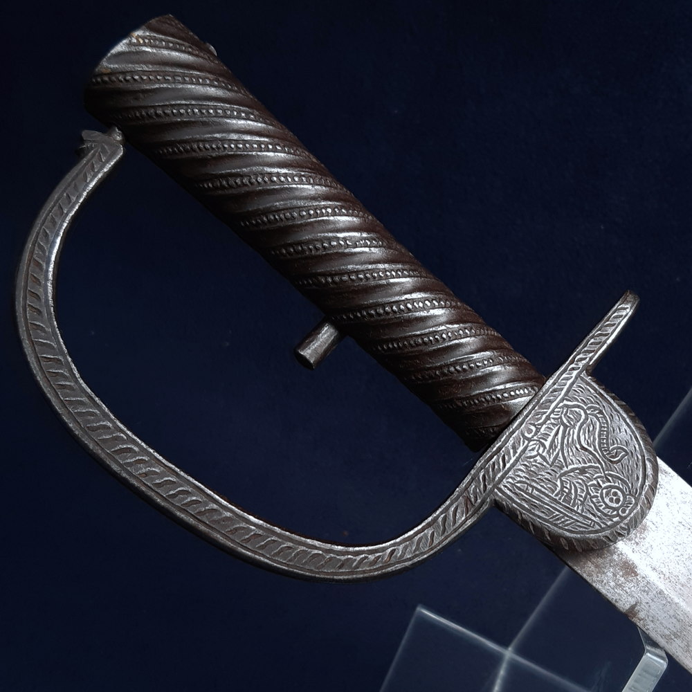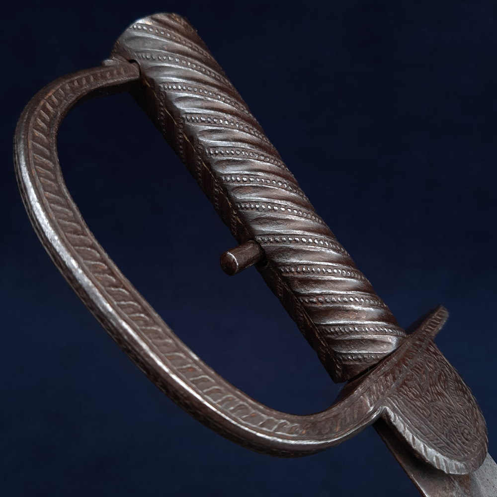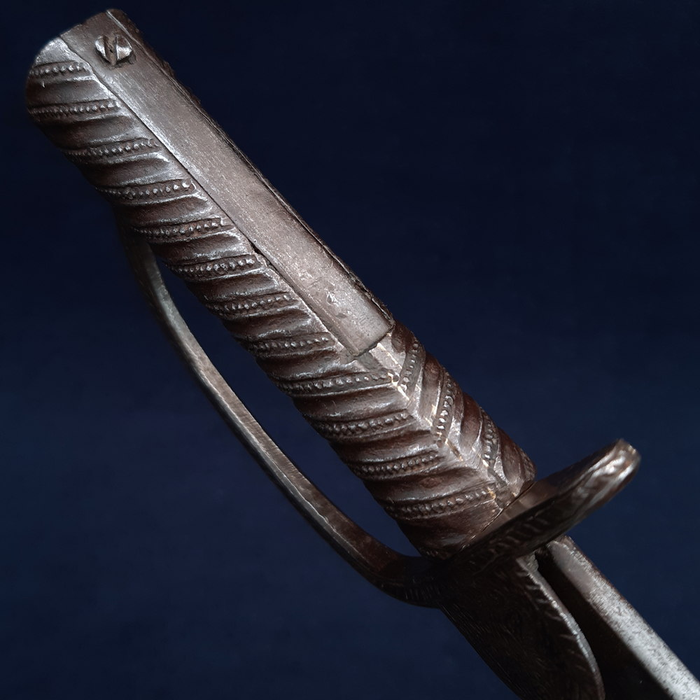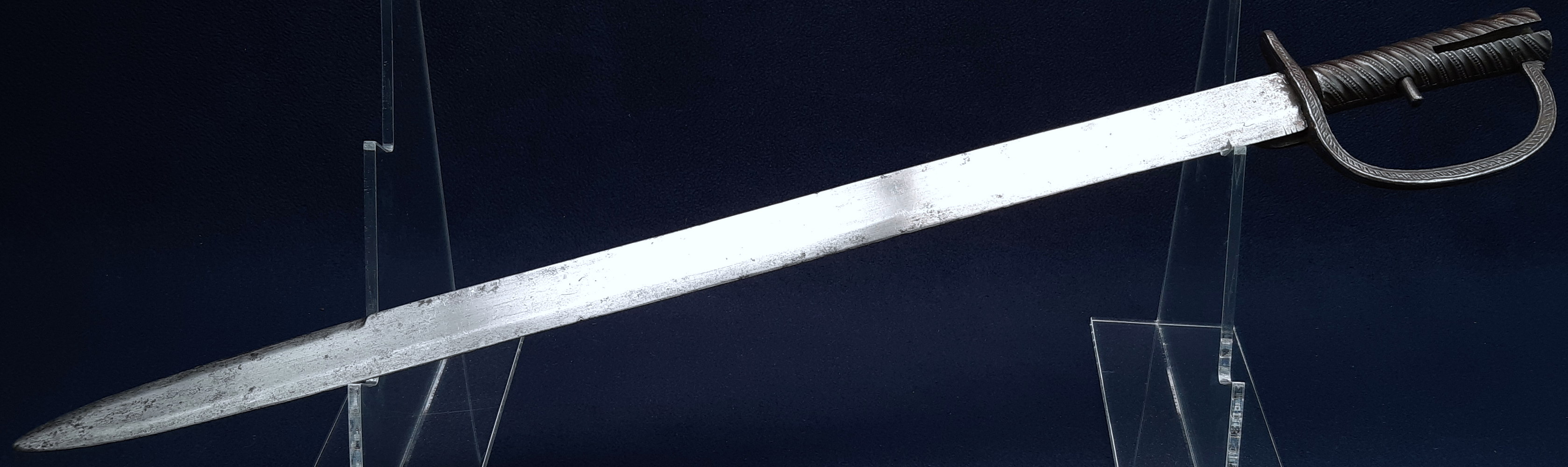 The locking mechanism functions, although I have not tested whether it will fit to a Brunswick. The blade has some forging imperfections, light scratching and some small spots of patination and light cleaned pitting in places, particularly towards the tip, which is rounded by ~3mm. A number of tiny nicks to both edges, one small notch to the true edge. The hilt has a dark forged finish with light rubbing wear to raised edges showing bright steel. The blade is solidly peened to the grip, slight movement to the knucklebow & langet.