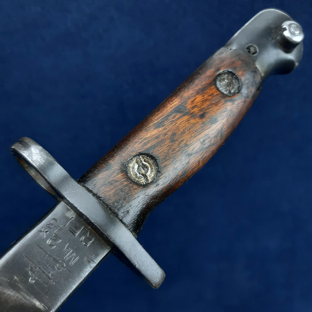 Straight unfullered knife blade with clipped point and 2-inch false edge. Wood grips secured by two screws, beaked pommel with oil hole. Brown leather scabbard with steel throat and chape, khaki canvas frog with retaining strap. Blade 11¾ inches in length, the bayonet 16½ inches overall.