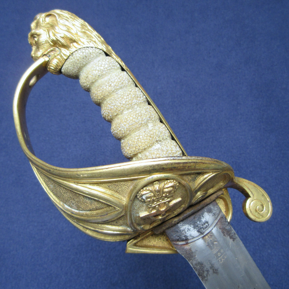 Triple-fullered broadsword blade 29 inches in length, 35 inches overall. Gilt brass half-basket hilt cast with a crown and fouled anchor within a cartouche, hinged inner guard, brass backstrap with lion head pommel cap, white shagreen grip, brass ferrule with sword knot ring. Black leather scabbard with gilt brass fittings at the throat, chape and middle, the throat with two opposed hanging rings and the middle piece with one hanging ring.