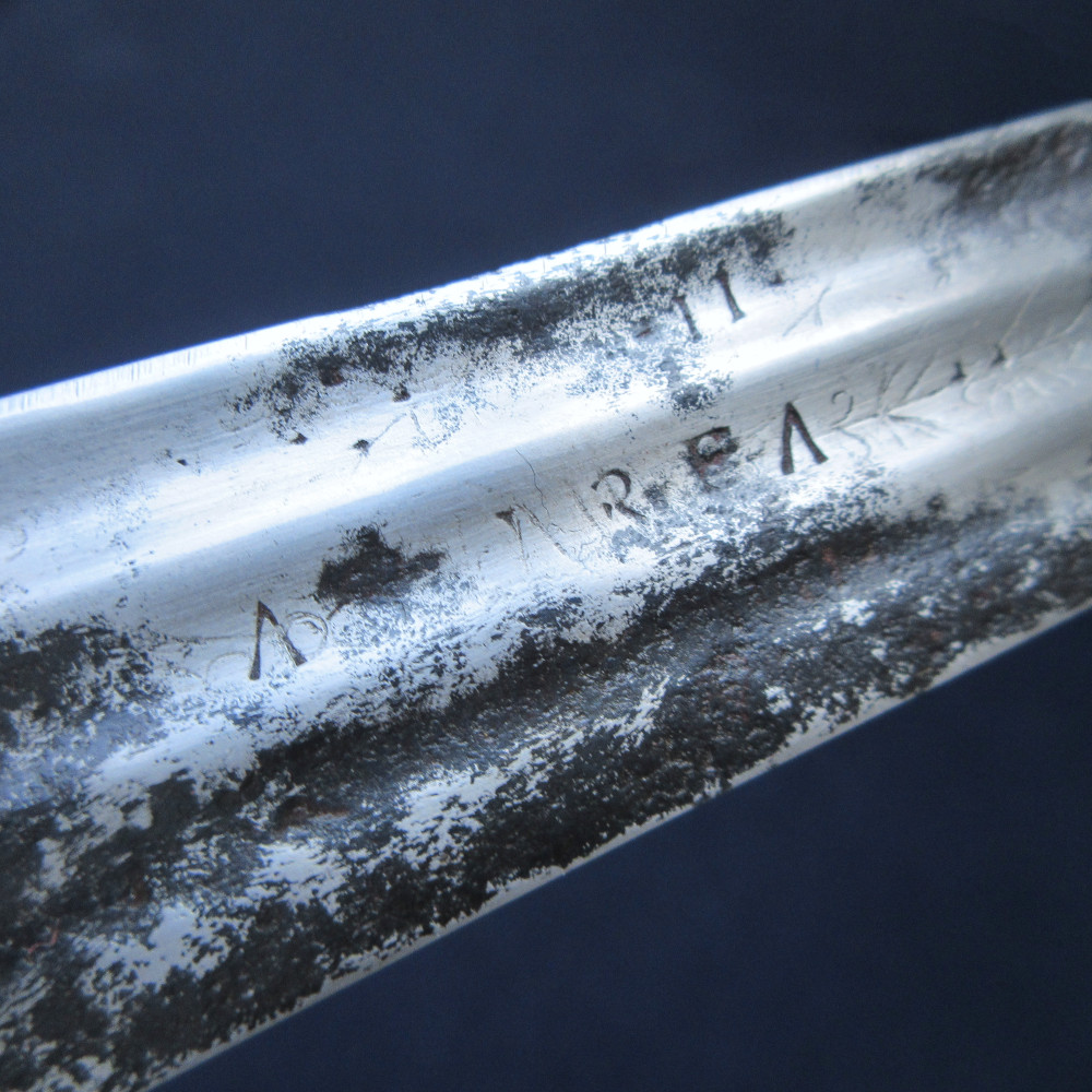 Andrea Ferrara is a name that appears quite often (with a number of spelling variations) on English and Scottish blades of the 17th century, leading to much speculation as to who this celebrated swordsmith was. Giovan Cigogna, describing Venetian swordsmiths in his book Trattato Militare (1583) writes that “in the town of Bellune are the ingenious master Giouan Donato and master Andrea dei Ferari, both brothers.” The town is today called Belluno, and a contract exists in the State Archives of Belluno from December 1578 in which these same brothers agree to supply 600 swords ‘of the kind used in England’ per month for ten years to a London-based importer, a huge quantity which suggests that their operation was at a significant scale for its time, although whether the contract was filled entirely or cancelled at some point is unknown.