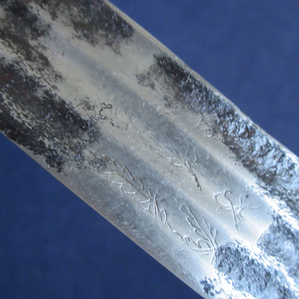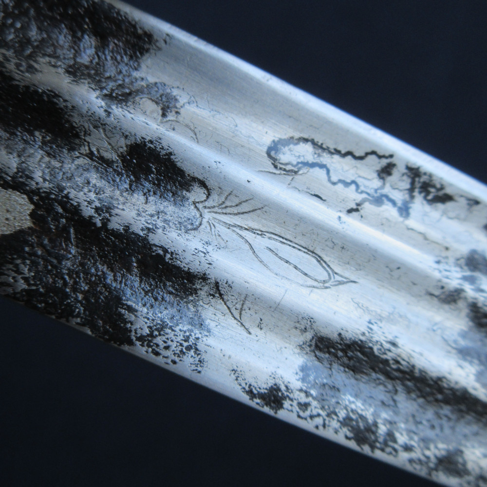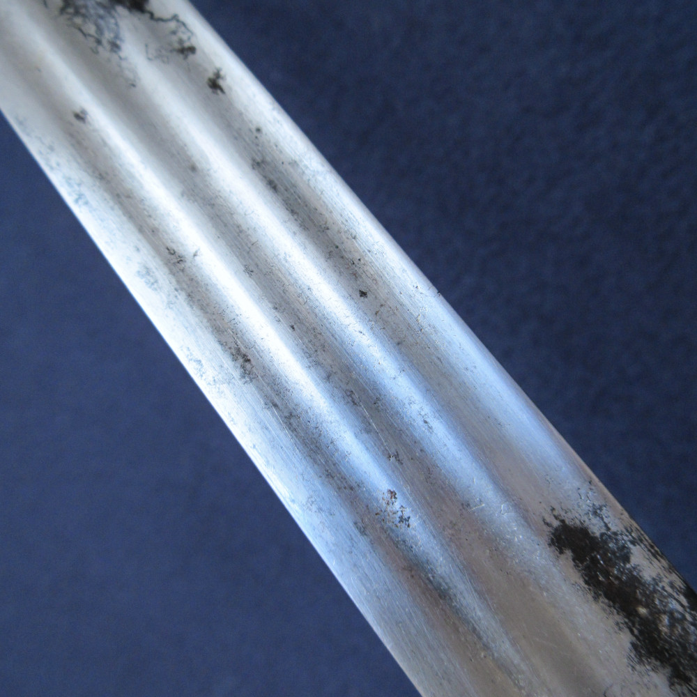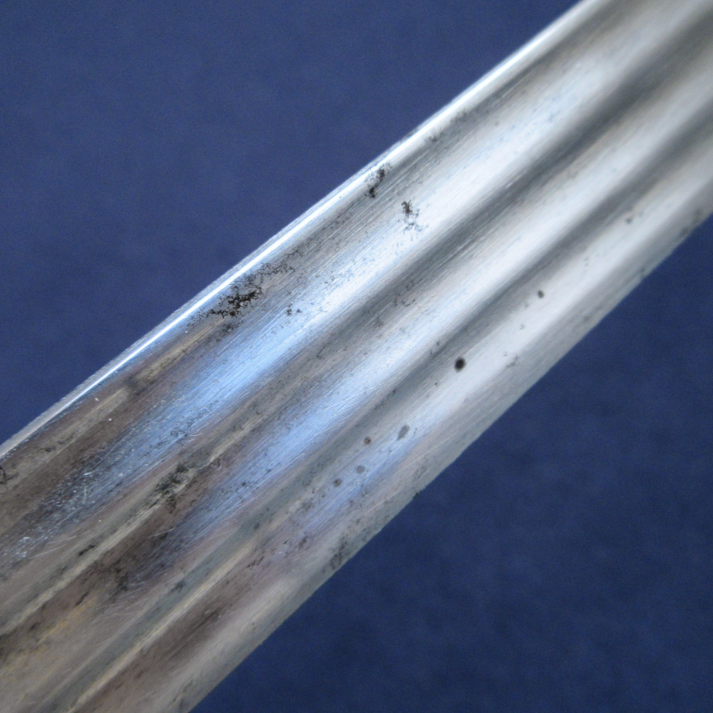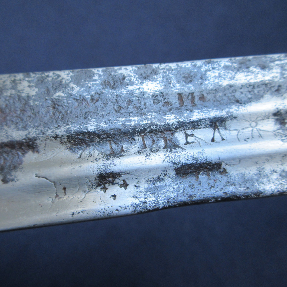 This sword is an example of an earlier practice, one more often seen in the Army, of officers reusing broadsword blades of the 17th or early 18th century, fitting them into the regulation pattern hilt and accoutrements to make them fit for service in a new era – or fit enough not to stand out too much on parade, at least. It is quite likely that these were inherited ‘family’ blades, since it was a common practice (particularly in Scotland) to rehilt swords and keep them in use over generations. I have found no reference to this being done to produce a naval sword before, this example may be rare or unique in that respect.