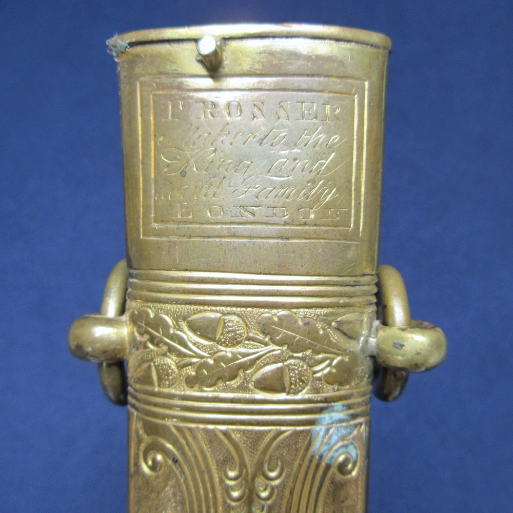 The blade is engraved on both sides with ‘ANDREA FARARA’ [sic], and also features the royal crown and coat of arms with motto ‘HONI SOIT QUI MAL Y PENSE’, a quatrefoil design, a sunburst at the ricasso and feathers (possibly the three feathers heraldrically associated with the Prince of Wales). The top piece of the scabbard is engraved with the maker’s mark ‘PROSSER Maker to the King and Royal Family LONDON’.