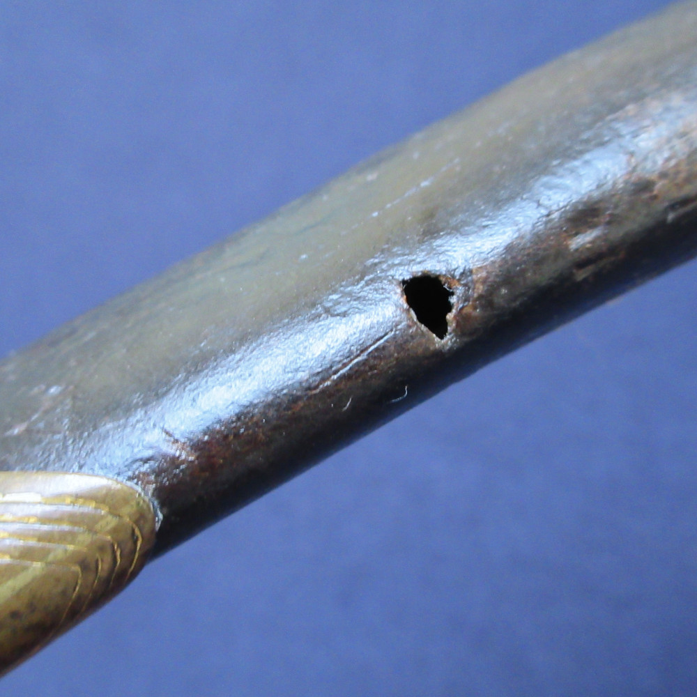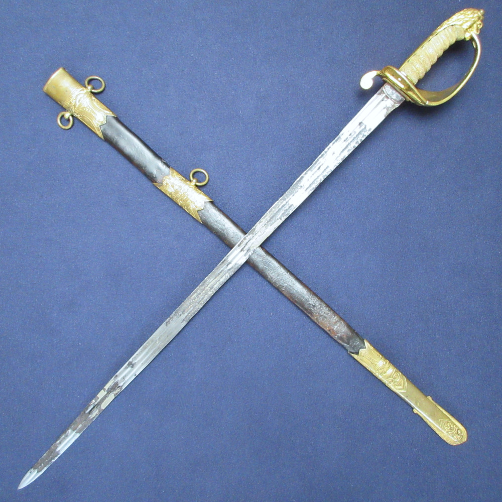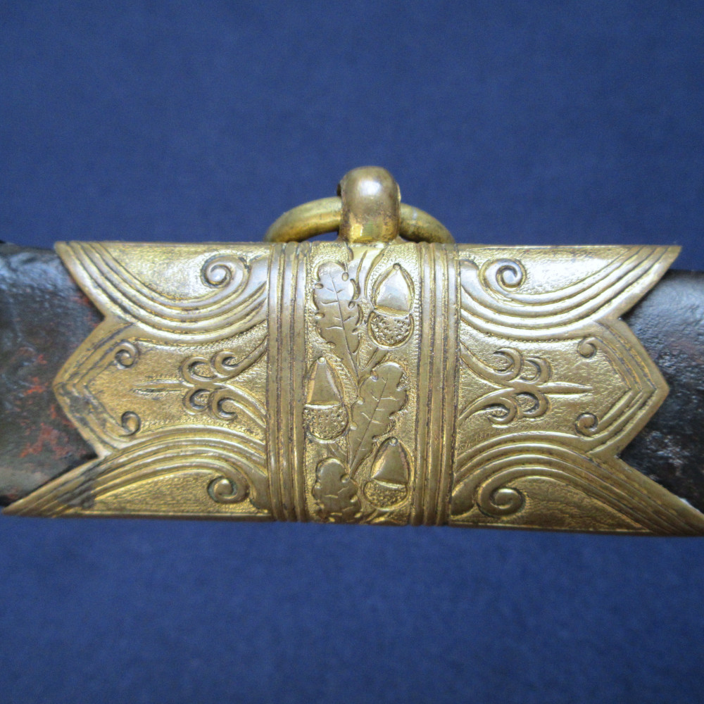 Higher-ranking naval officers could get away with significant variations in their uniform swords – some are even recorded as having carried foreign swords or British models that had been declared obsolete. This scabbard may have been produced at a later date than the sword, either after the 1832 regulations or upon the officer’s promotion to flag rank, since the ring fixed to the ferrule typically indicates an early example of the 1827 Pattern sword hilt.