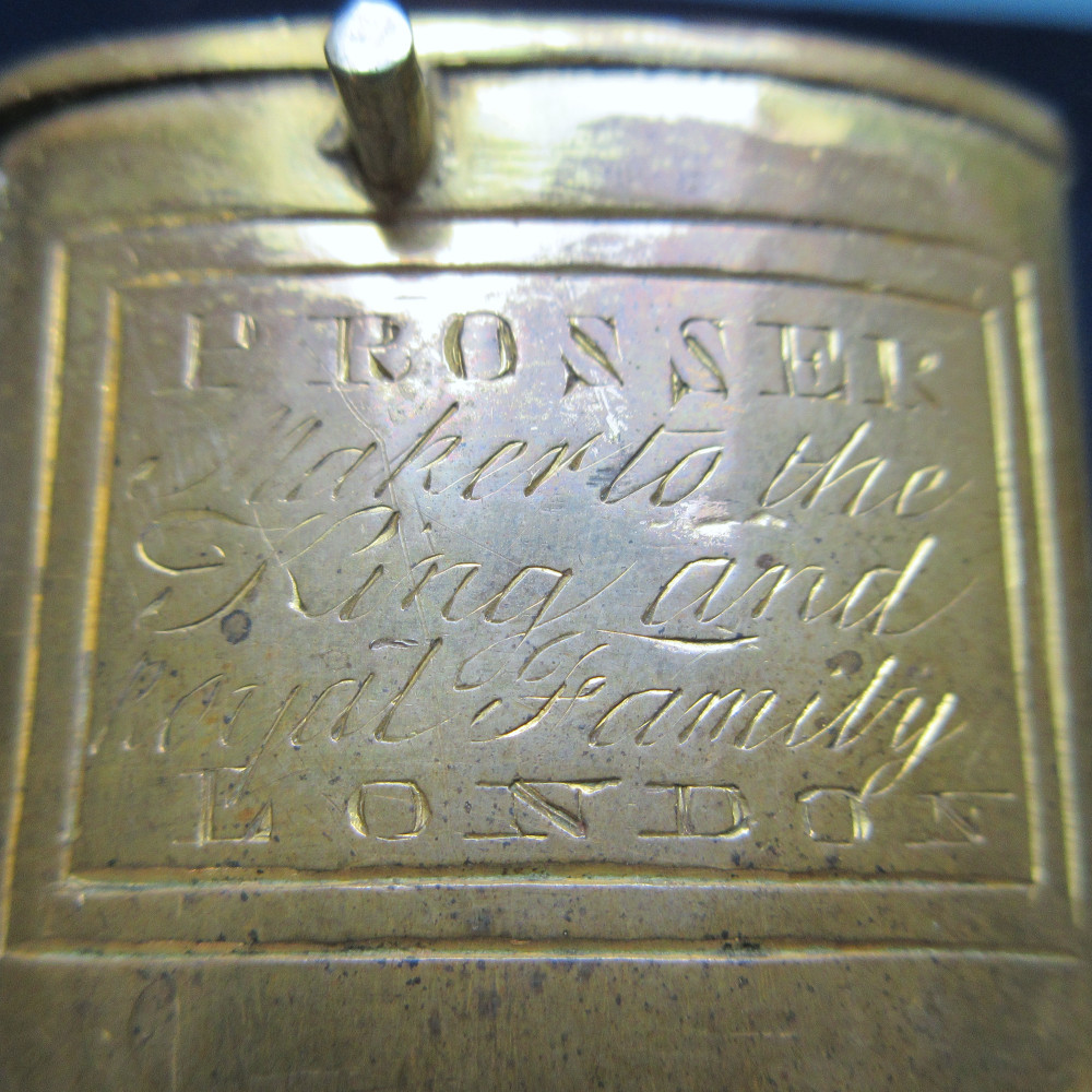 John Prosser was a prominent London sword cutler who took over the business of his employer Thomas Cullum in 1795 and traded on Charing Cross Road until 1860, specializing in high-quality blades including custom officer’s swords and presentation swords. He was creative with his commissions and invented the ‘quill-point’ blade in 1818. In his early years of business he developed a close relationship with the Prince of Wales, whose infatuation with military pomp led him to commission several swords from Prosser, including a set awarded to the officers of the 10th Hussars, his pet cavalry regiment, in 1808. This connection was rewarded with titles: Prosser was appointed Sword Cutler and Beltmaker to King George III and in 1820 was made Sword Cutler in ordinary to King George IV (the former Prince). Prosser’s firm proudly displayed these royal connections on every sword sold, in this case a custom version of the naval officer’s hilt and scabbard to accommodate a pre-existing blade. It is possible that Prosser did not do the rehilting, since Prosser-made naval swords typically do not feature a folding guard, but this cannot be proven either way without a maker’s mark on the sword itself.