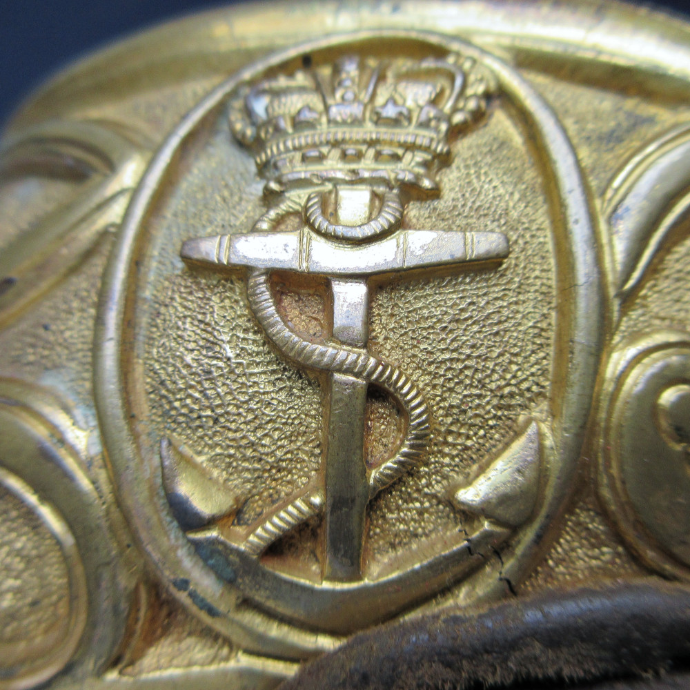 The level of decoration of the scabbard signifies that this was the sword of a flag officer – that is, an officer with a rank higher than Captain. It conforms to regulations laid down in 1832 for flag officer’s scabbards, with one modification – a third hanging ring was added later on the opposite side of the chape piece to the original. This was a change introduced in 1847, showing that this sword was still being carried by that date.
