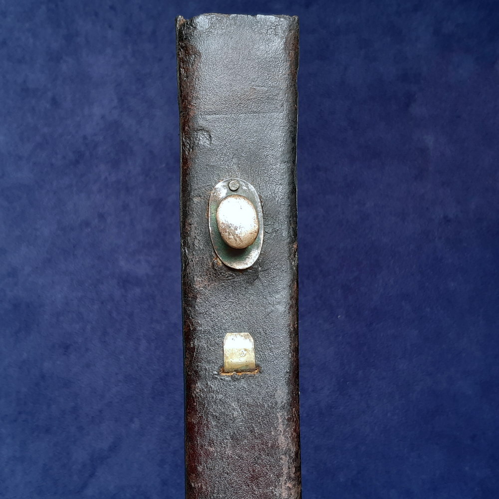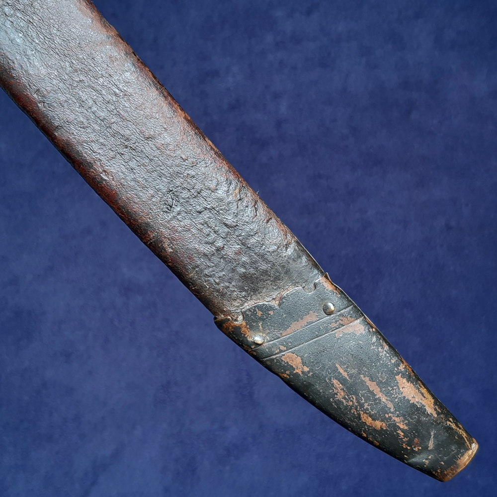 The leather of the scabbard has some rubbing and knocks but remains strong with no losses to its stitching (possibly a repair/reinforcement to the stitching at the throat end, although this does not look modern). Some patination to the copper stud. The brass chape piece has some light dents and some rubbing & flaking to its black paint revealing patinated brass, more extensive on the rear side. Assuming there was a leather washer, this has been lost.