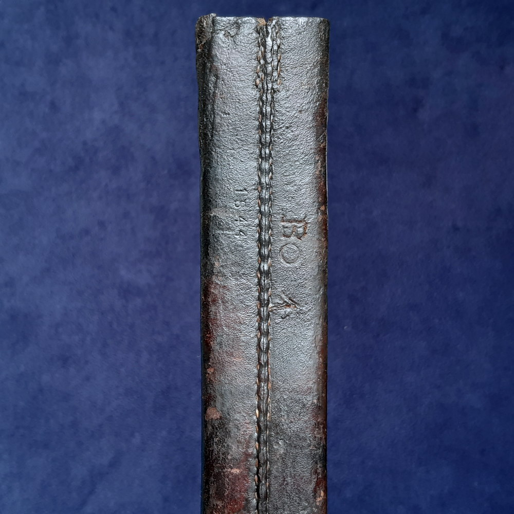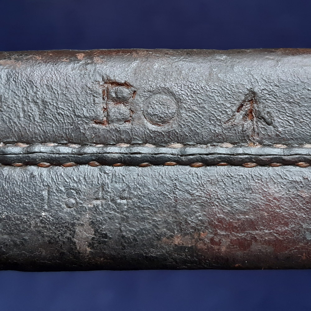 The leather of the scabbard is stamped on the rear side next to the seam with ‘BO’ and a broad arrow, the ownership stamp of the (British) Board of Ordnance, as well as ‘1844’, again presumably the production date.