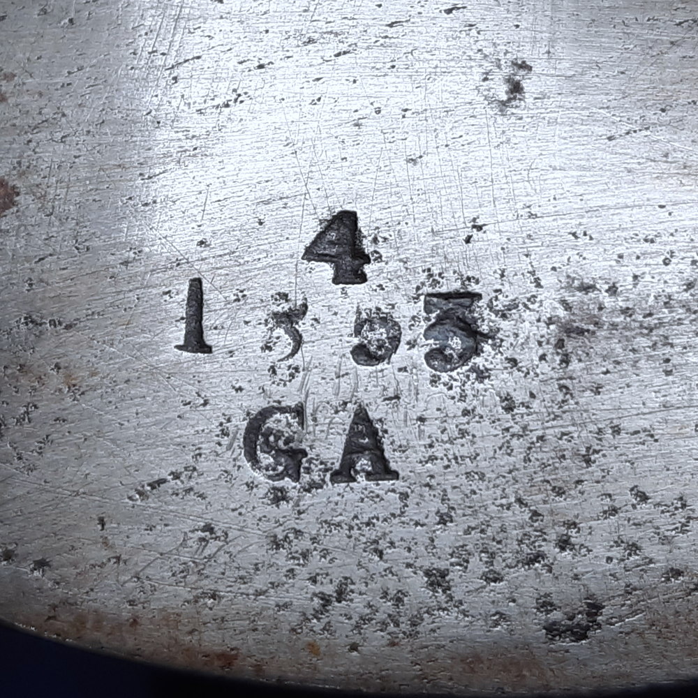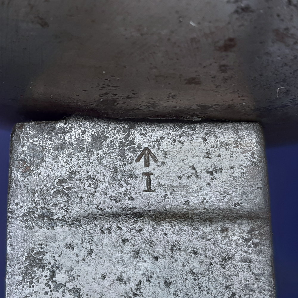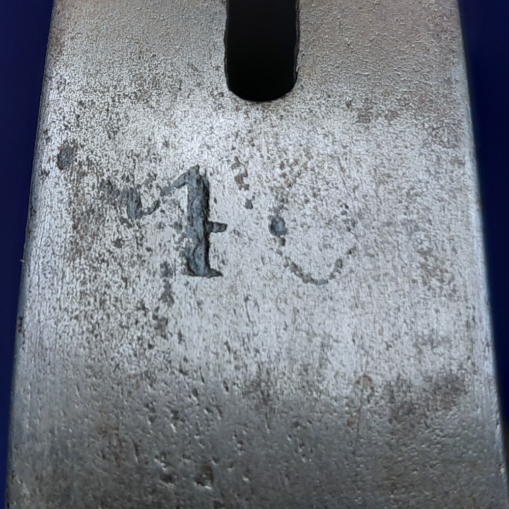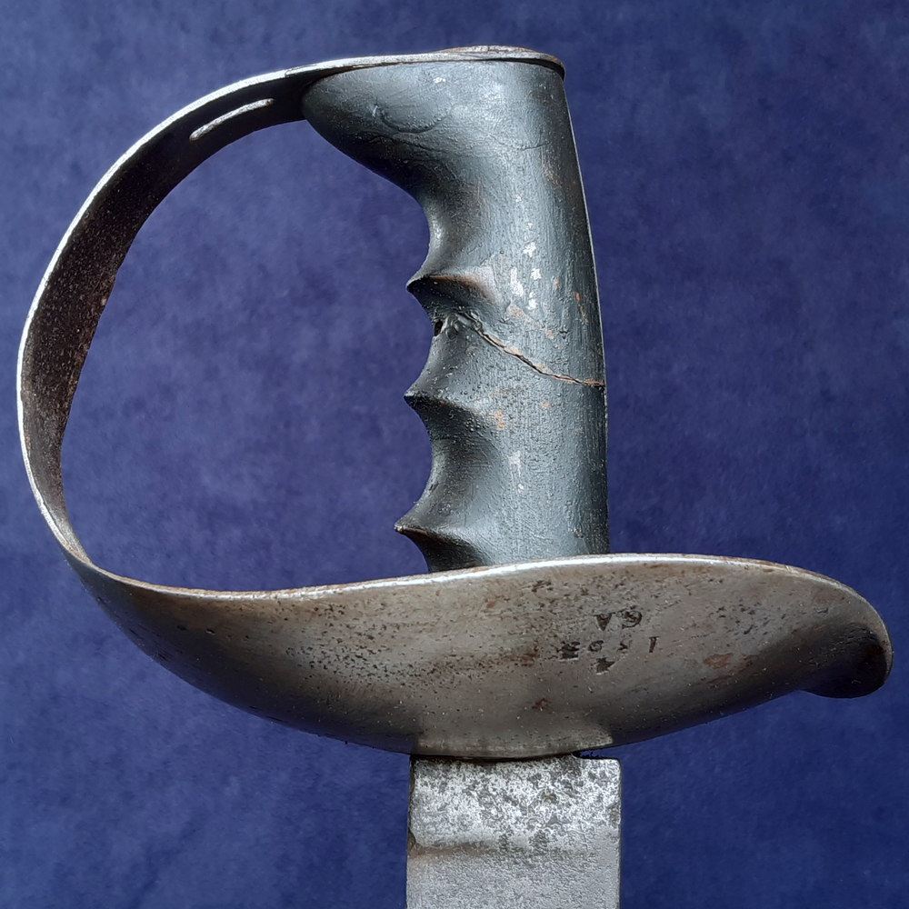 The blade is stamped at the ricasso on one side with a broad arrow above ‘I’, which is an Indian government stores mark. The spine of the blade is stamped with ‘1844’, presumably the production date. The outside of the hilt is stamped with ‘4 1853 GA’. 1853 is probably the issue date, GA probably indicates a unit, although I am unsure what unit this may be. The hilt is stamped next to the knot slit with ‘40’, probably a rack number.
