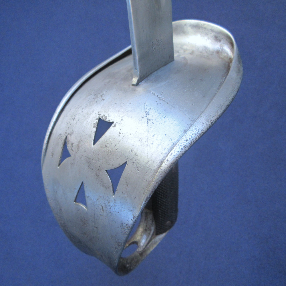 Curved, single fullered blade, ambidextrous basket hilt with pierced Maltese Cross symbol and turned-over edges, black pressed leather grips secured by five steel rivets. Overall length 1.02m (40 inches) blade length 88cm (34½ inches). Wood-lined steel scabbard with two fixed mounting rings near the throat.