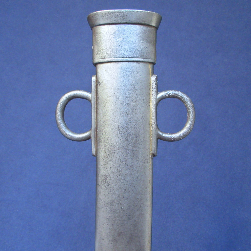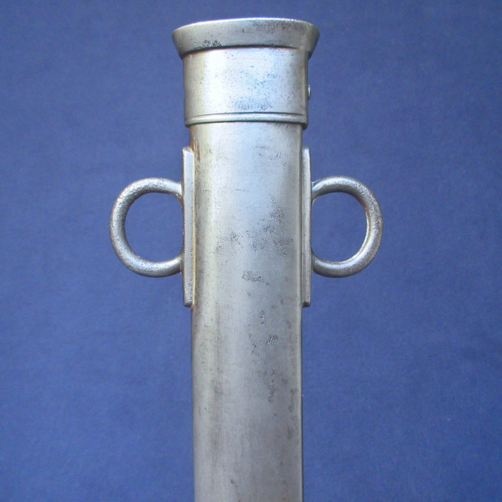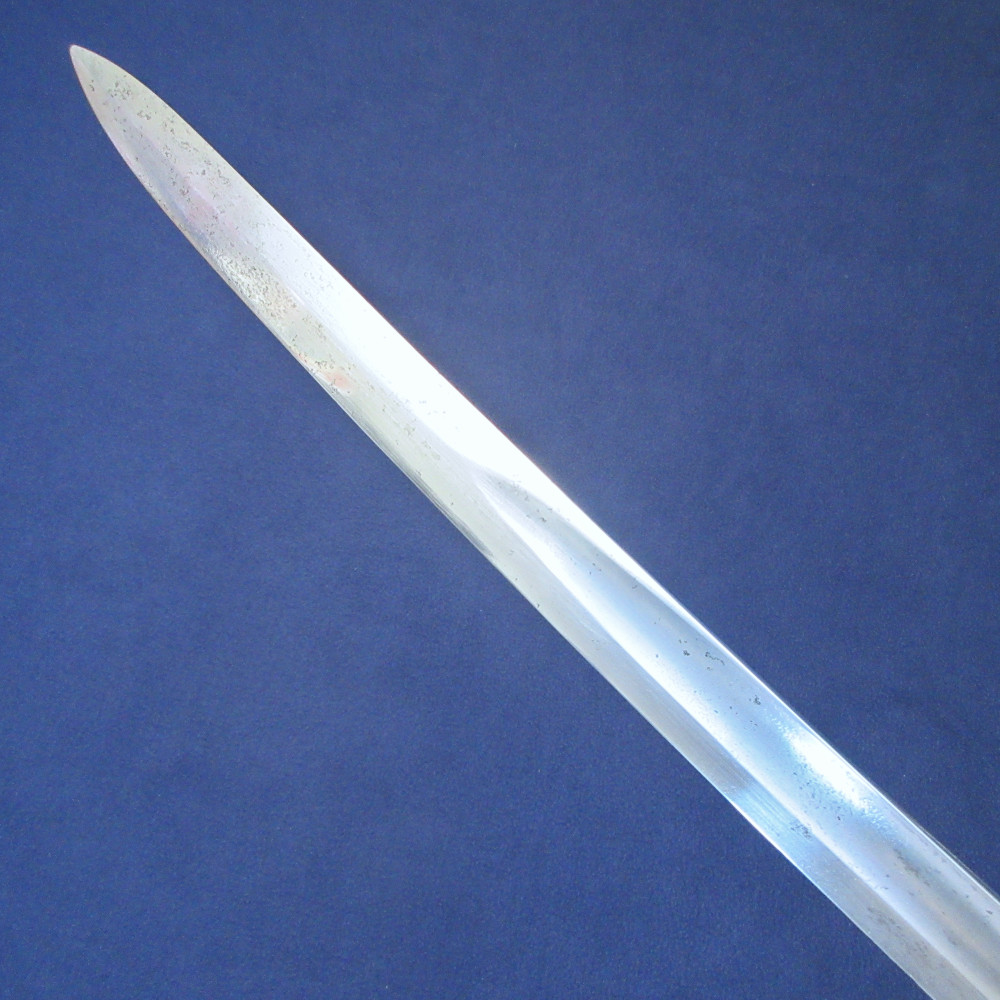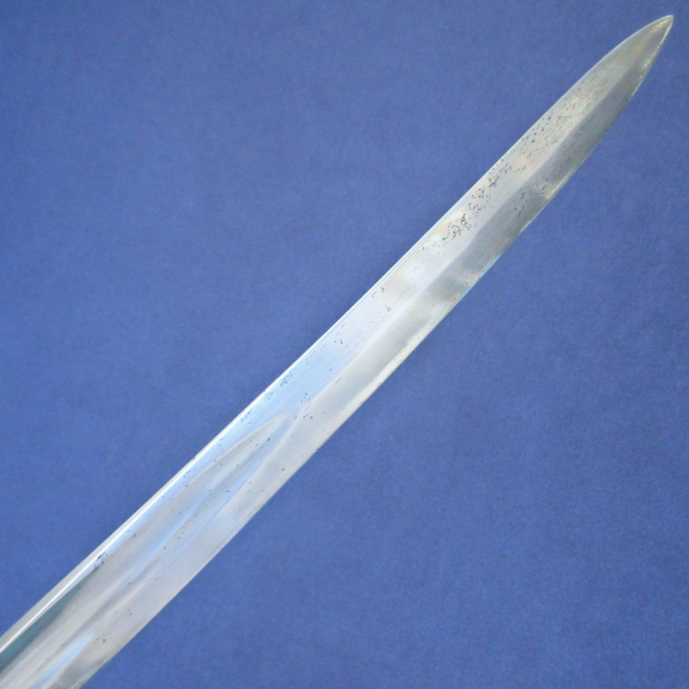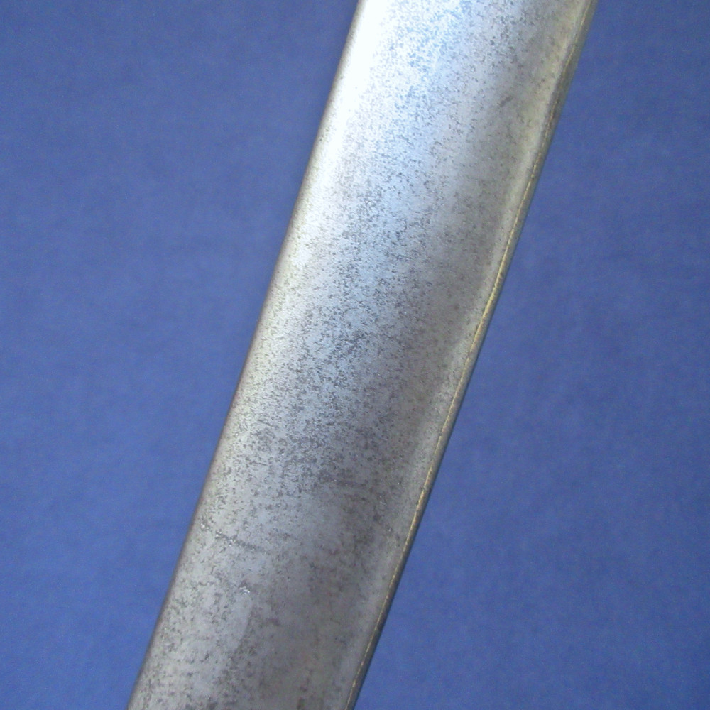 The blade is bright with some peppered pitting towards the tip. Some pitting to the hilt. The pressed leather grips are in good condition with little handling wear to the chequering,. The original leather washer has been lost. The scabbard has some patination and areas of light pitting, and three small dents to its lower section.