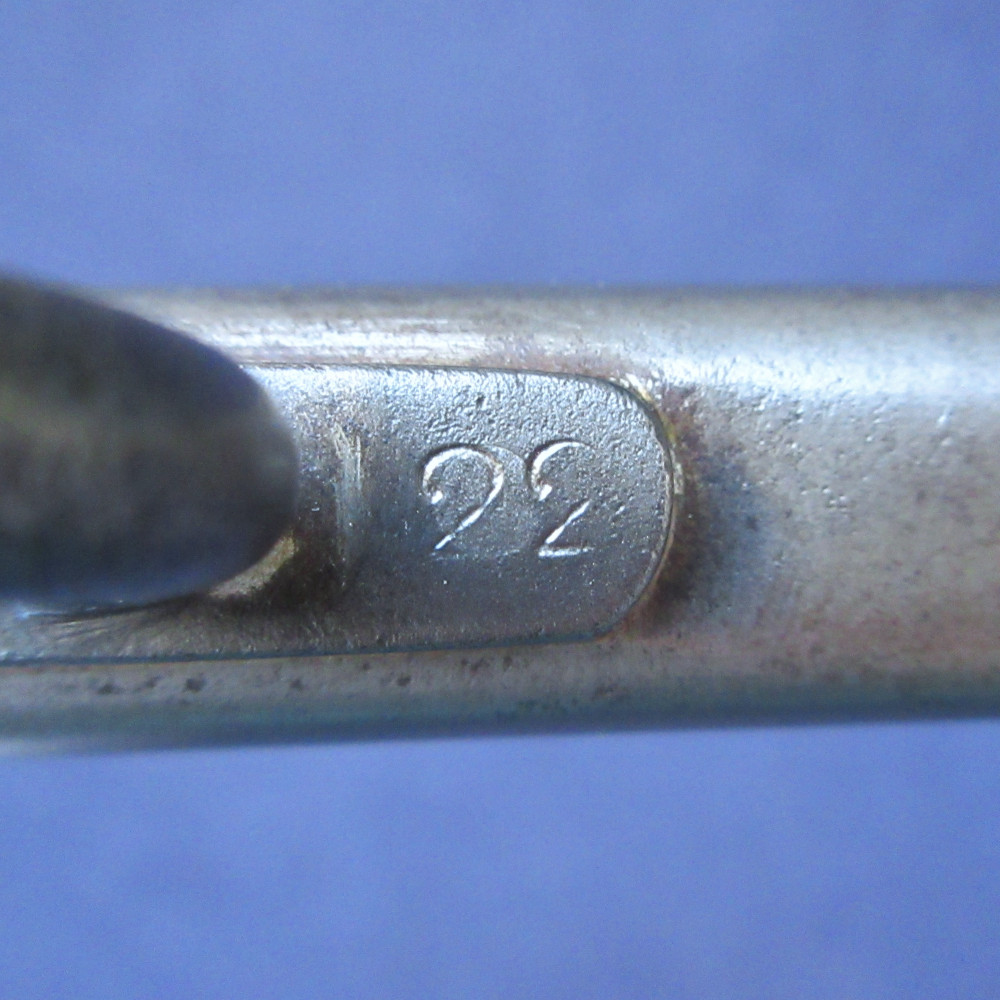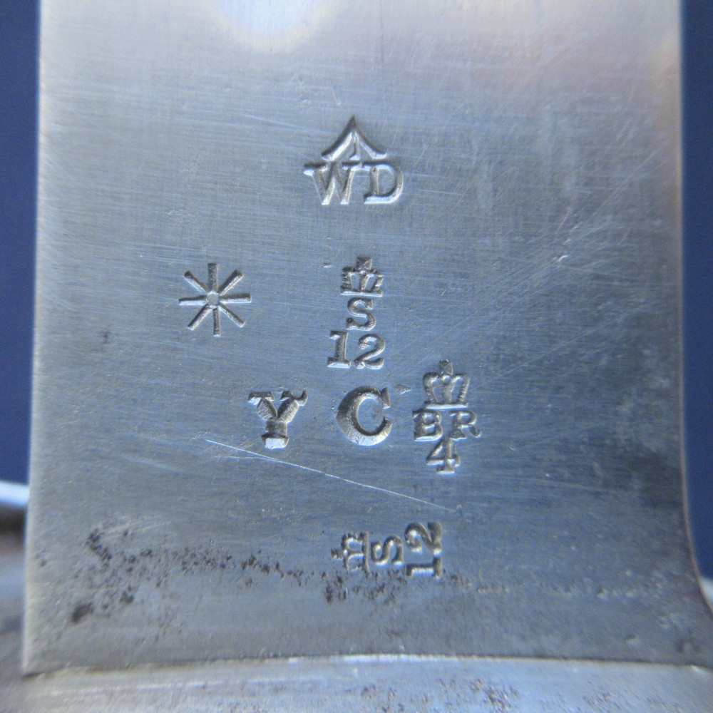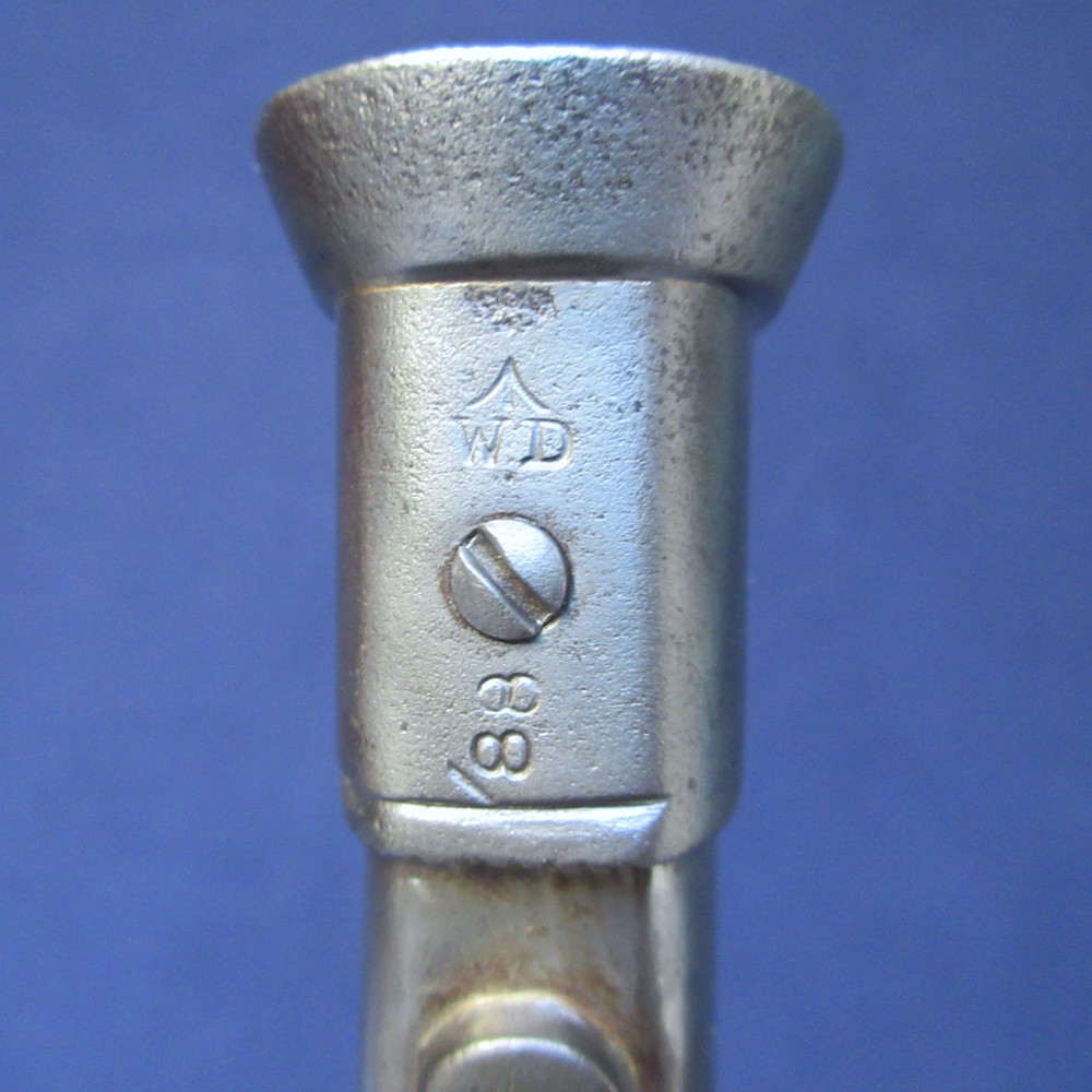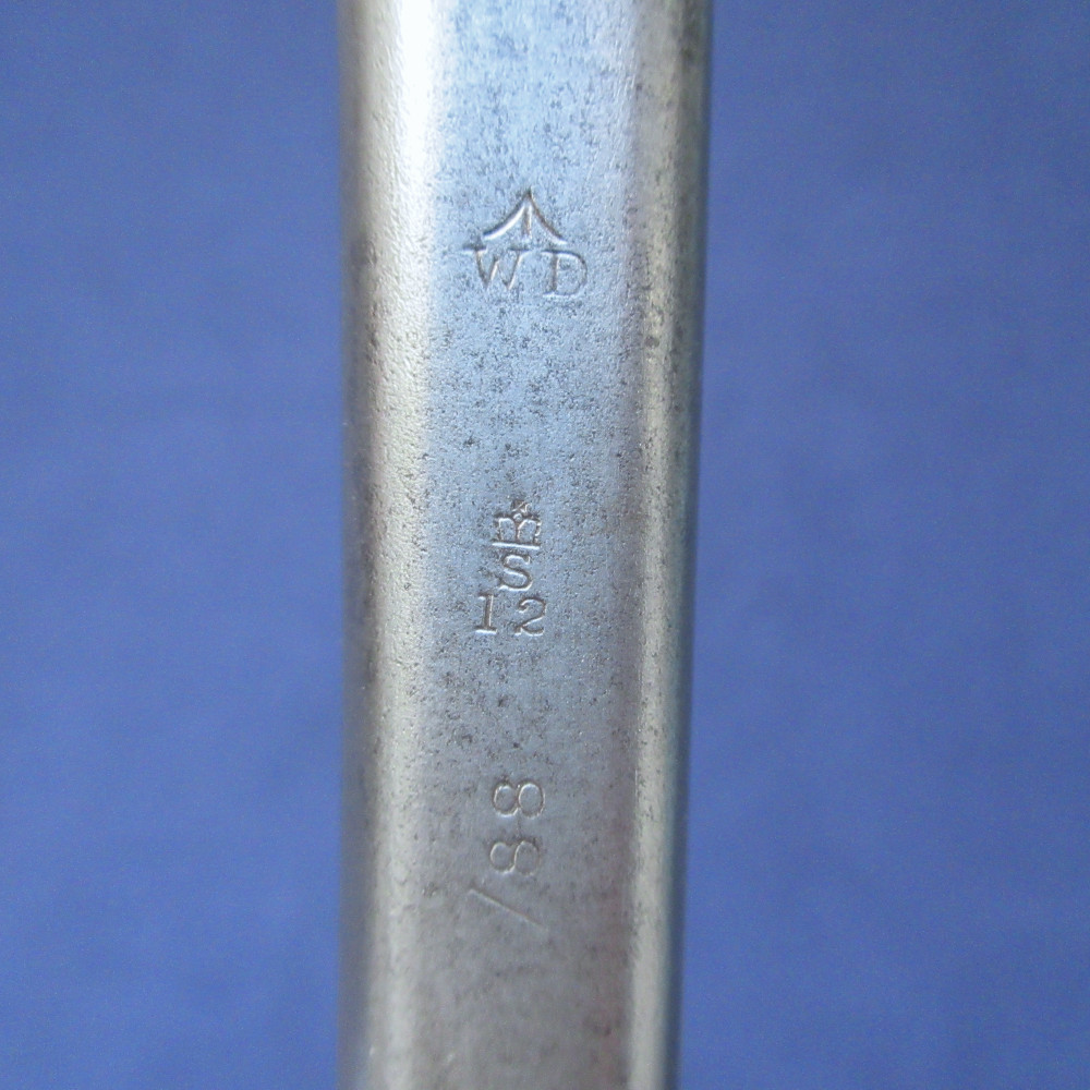 The flat base of the mounting ring on the scabbard’s trailing edge is also stamped with ‘WR YC’ and ‘22’. Above this mounting ring the throat piece of the scabbard is stamped with another broad arrow War Department mark, and the date ‘/88’. Below the mounting ring the spine of the scabbard is stamped with a further broad arrow War Department mark, a Solingen inspection mark identical to those on the blade and the date ‘/88’ again. Based on the commonality of markings the blade and scabbard must be an original pair.