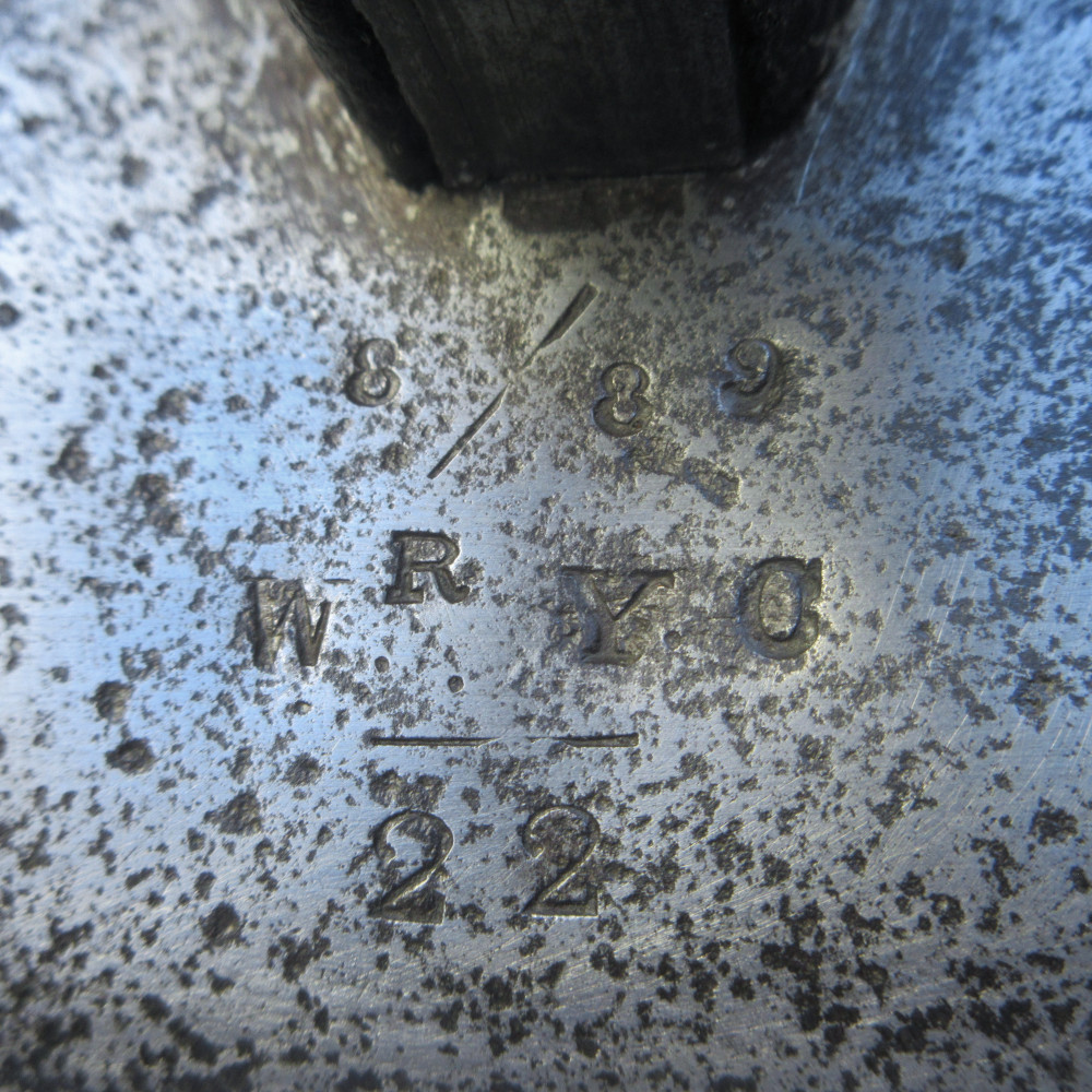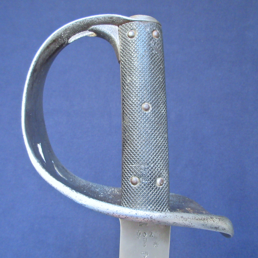 The blade is stamped on one side with the maker’s mark ‘Weyersberg Kirschbaum & Co Solingen’ and issue dates ‘5/88’ and ‘6/89’, and on the other side with ‘Y C’ indicating issue to a unit of Yeomanry Cavalry, a broad arrow and ‘WD’, indicating War Department property, two crown inspection marks with ‘S’ for Solingen, a crown inspection mark with ‘BR’ indicating that the sword underwent repair at Birmingham, and a mark of eight lines radiating from a circle, the meaning of which is unknown – I have seen it on other Solingen import blades of the period so it may be a factory mark. The spine of the blade is stamped with the same Solingen inspection mark. The outside of the hilt is stamped with another broad arrow War Department mark. The inside of the hilt is stamped with another issue date ‘8/89’, ‘WR YC’, indicating the Worcestershire Yeomanry Cavalry, and ‘22’, a rack number.