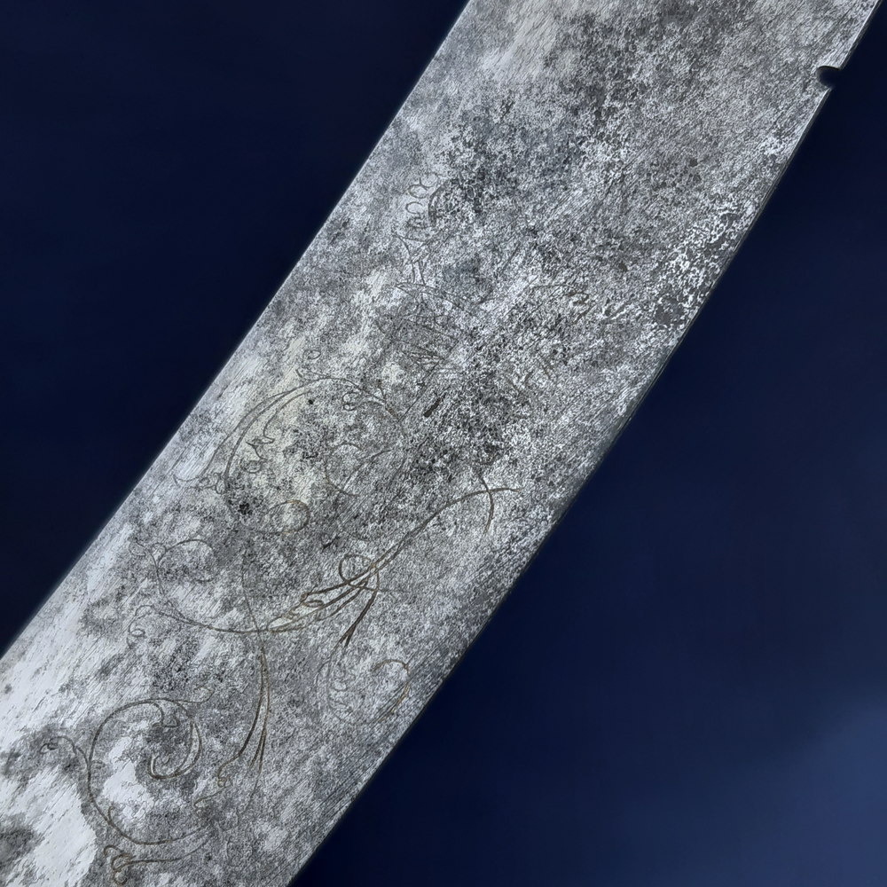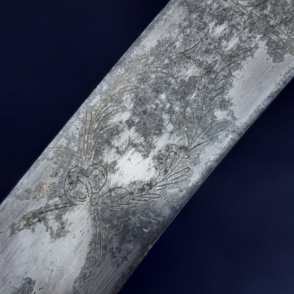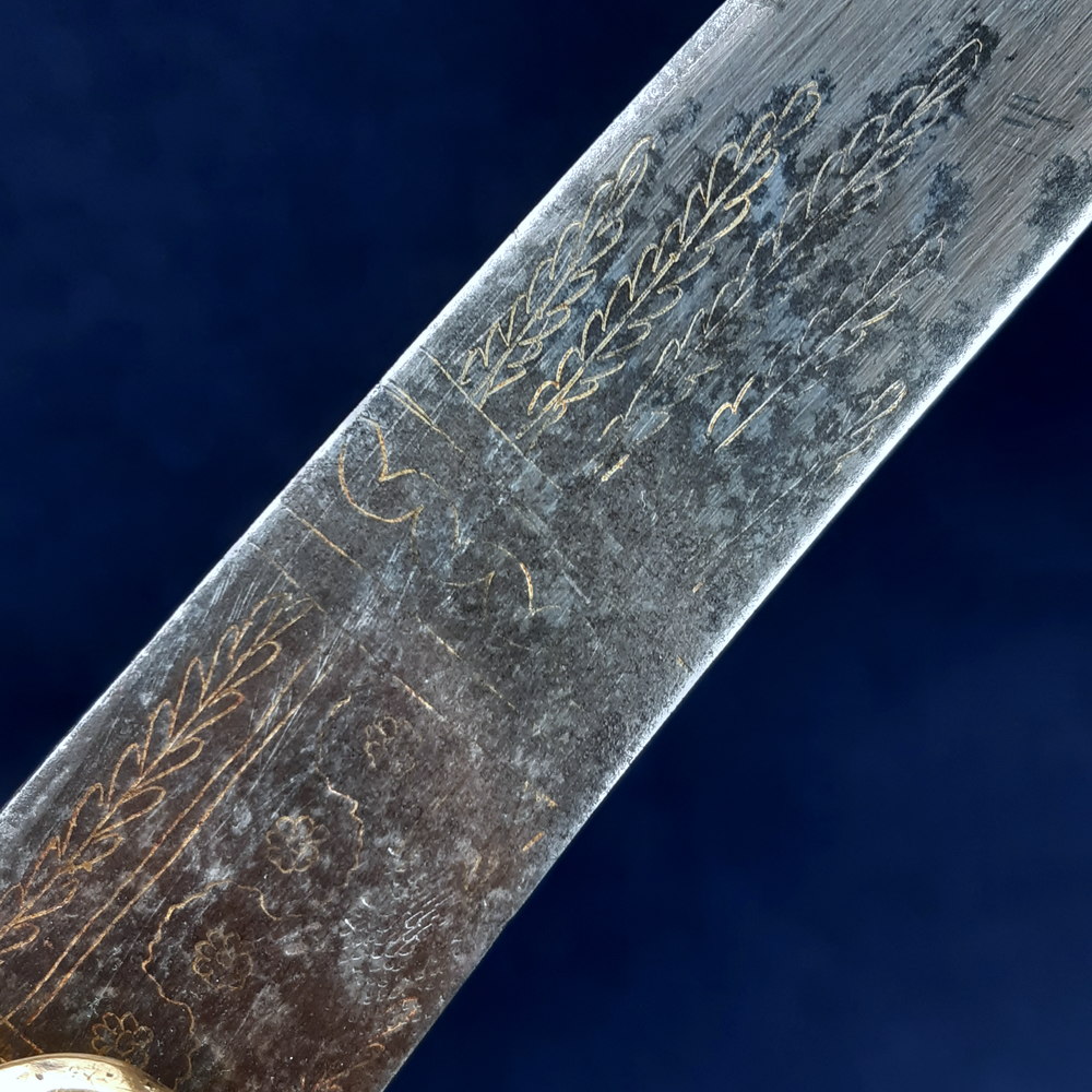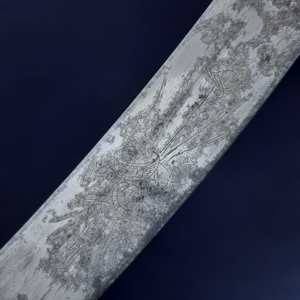The blade appears to have been made as a blue & gilt piece along 2/3 of its length – the blueing has been fully lost or patinated while some gilding remains in the etching. The substantial etched decoration remains, consisting of motifs of palm fronds, victor’s laurels, a stand of arms, the crown and ‘GR’ cypher of King George III, an allegorical classical figure of winged Victory holding a laurel wreath and palm frond, another figure of Britannia (the personification of the United Kingdom) with her spear* and shield emblazoned with the Union flag, and the royal coat of arms including the horse of Hanover. Its tiny details are impacted by pitting but the top right quarter appears to show a lion rather than a fleur-de-lys, this would indicate the coat of arms used post-1801 Act of Union.