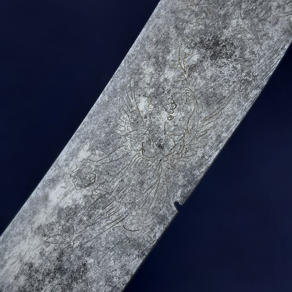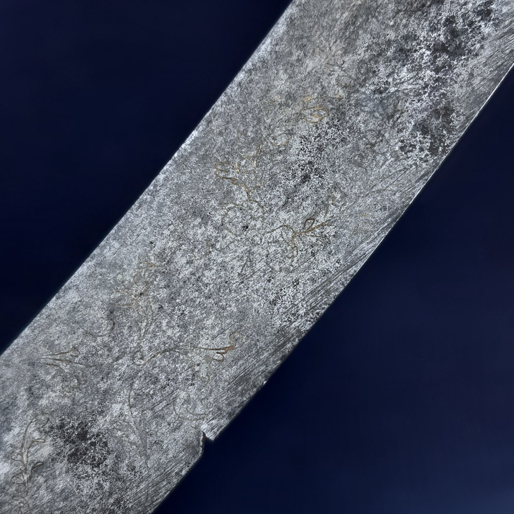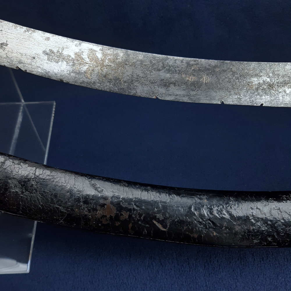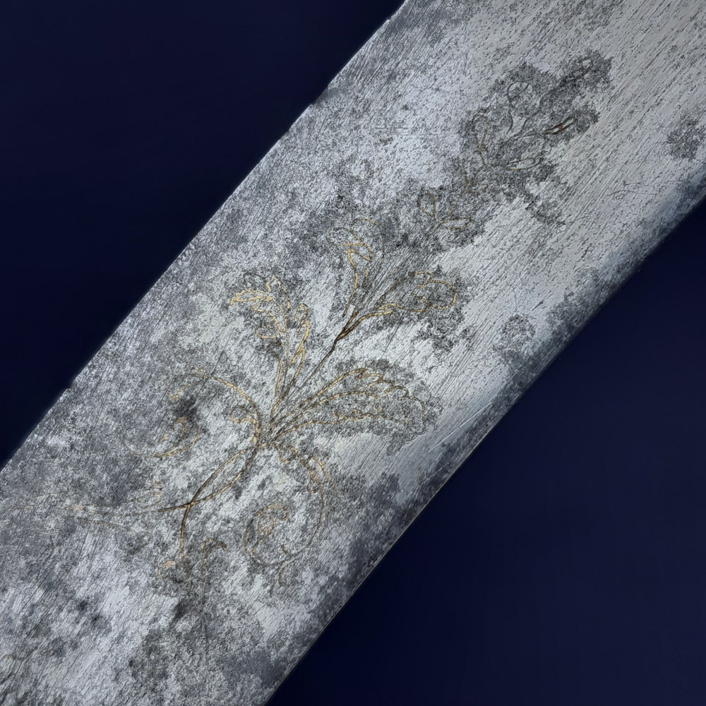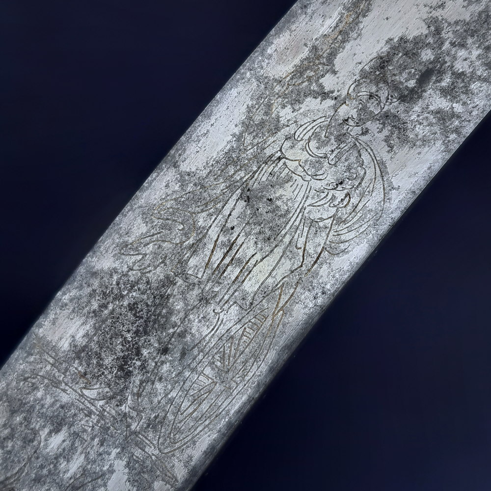 The blade appears to have been made as a blue & gilt piece along 2/3 of its length – the blueing has been fully lost or patinated while some gilding remains in the etching. The substantial etched decoration remains, consisting of motifs of palm fronds, victor’s laurels, a stand of arms, the crown and ‘GR’ cypher of King George III, an allegorical classical figure of winged Victory holding a laurel wreath and palm frond, another figure of Britannia (the personification of the United Kingdom) with her spear* and shield emblazoned with the Union flag, and the royal coat of arms including the horse of Hanover. Its tiny details are impacted by pitting but the top right quarter appears to show a lion rather than a fleur-de-lys, this would indicate the coat of arms used post-1801 Act of Union.
