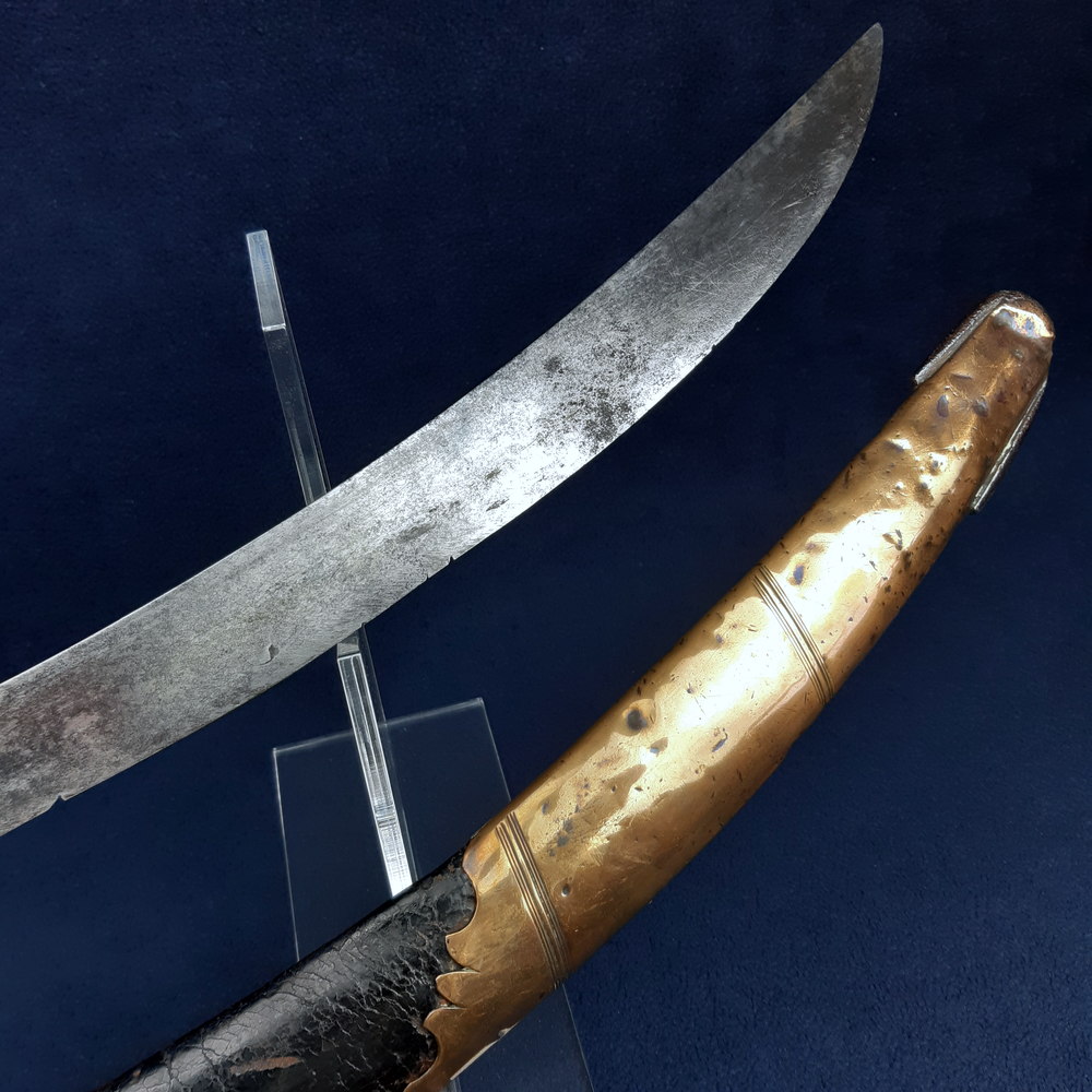 Curved single-edged unfullered blade with hatchet point. Brown leather washer, brass P-shaped hilt with faceted knucklebow, comma-shaped quillon, semioval langets. Brass ferrule, faceted backstrap & integral pommel. Ivory grip, partly chequered. Scabbard with wood core covered with black leather, brass fittings at the throat, middle and chape, middle & throat pieces with brass hanging rings. Blade 27¾ inches in length past the washer, the sabre 32¾ inches overall pommel to tip.