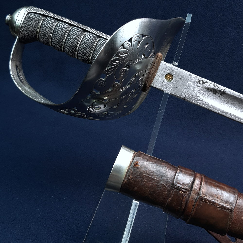 Straight single-fullered spear-pointed blade. Steel hilt with pierced decoration including the crown and cypher of Edward VII, and sword knot slit. Steel ferrule, fully chequered steel backstrap, integral oval pommel with tang button. Wire-bound black shagreen grip, brown leather washer. Brown leather field scabbard with frog strap and nonferrous throat piece, probably nickel-plated brass. Blade 32½ inches in length, 1.04 inches wide at the shoulder, the sword 38¾ inches overall.