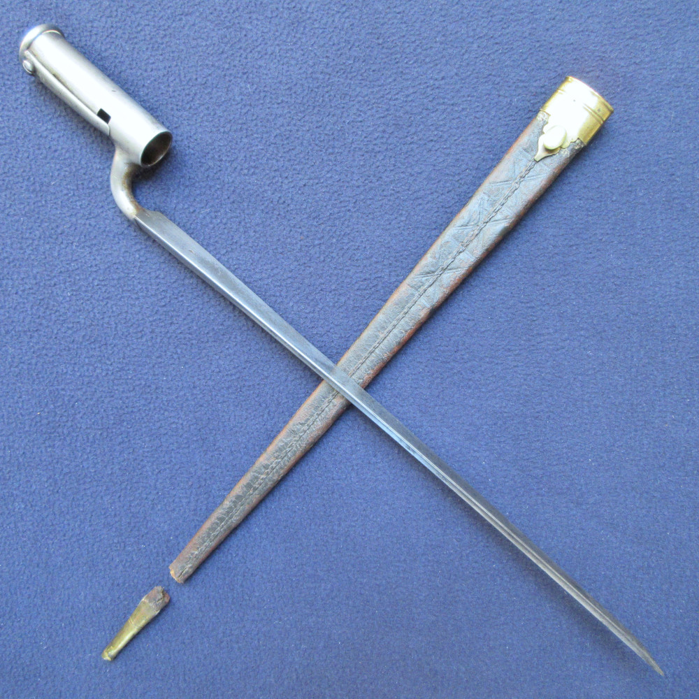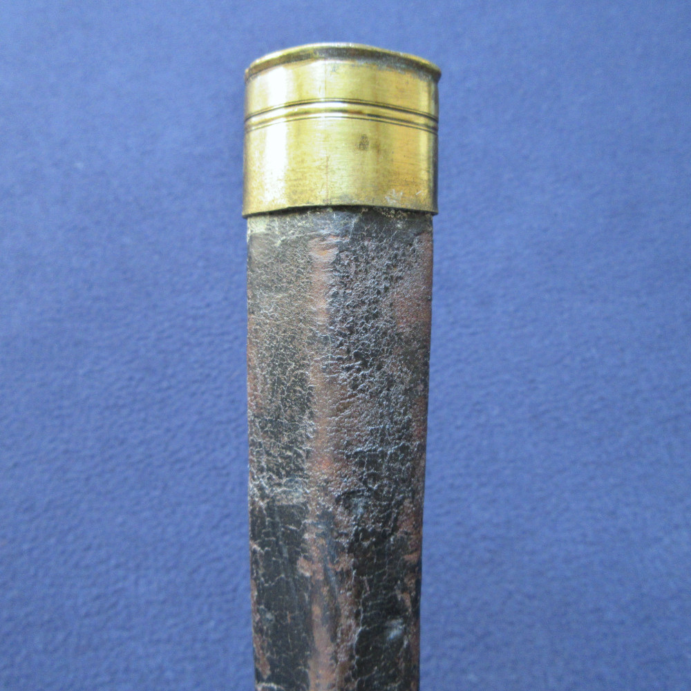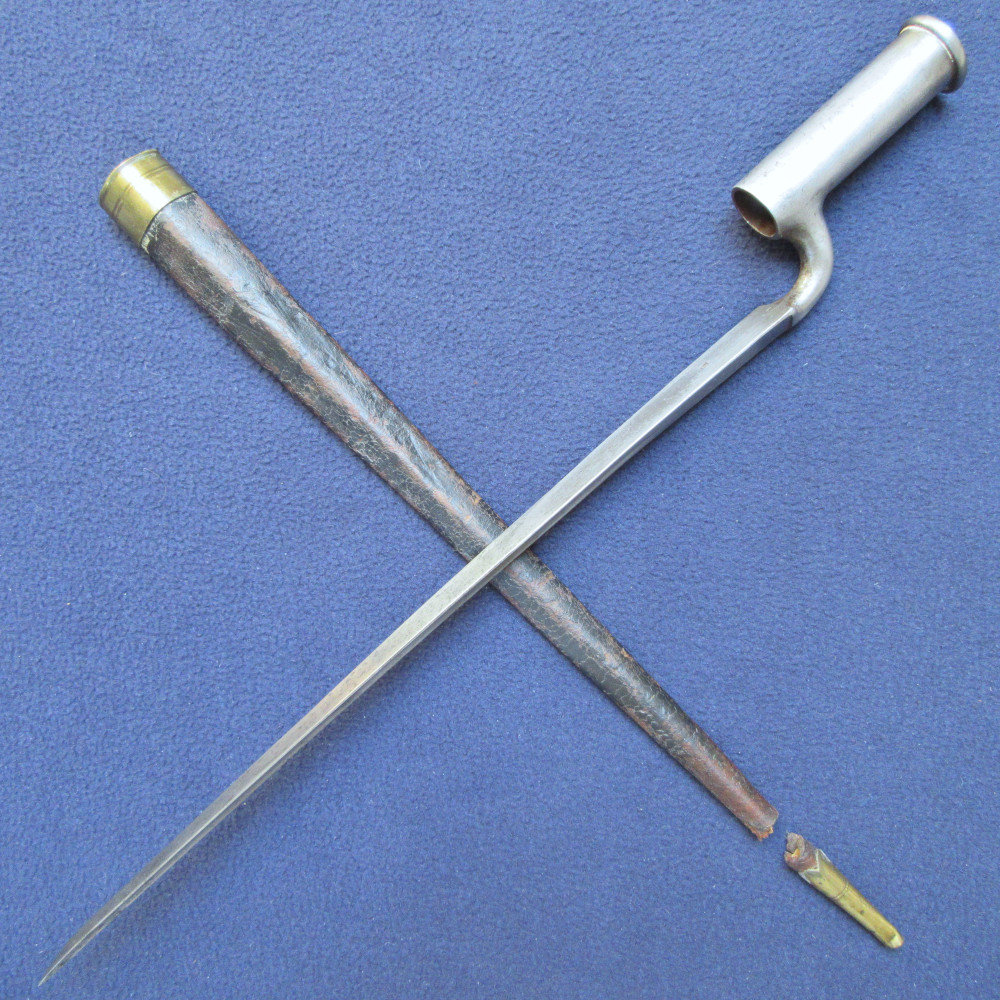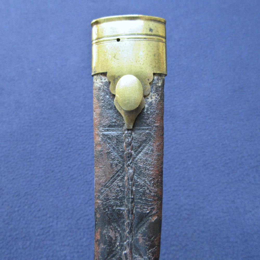 The bayonet is clean overall with only small areas of patina and some very light pitting near the tip of the blade. The brass chape piece and a small amount of leather have become detached from the rest of the scabbard. The detached chape piece has several dents, the throat piece has one very small one to its rim. The leather of the scabbard is quite worn in places, with rubbing to raised edges and surface cracking.