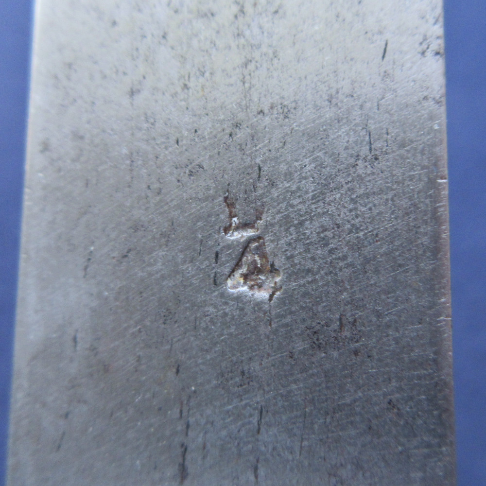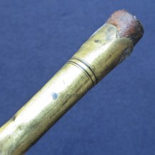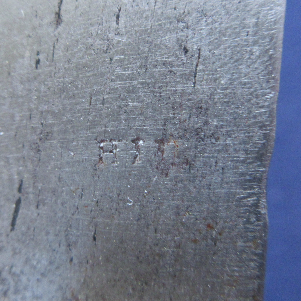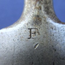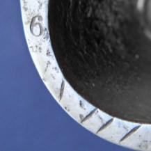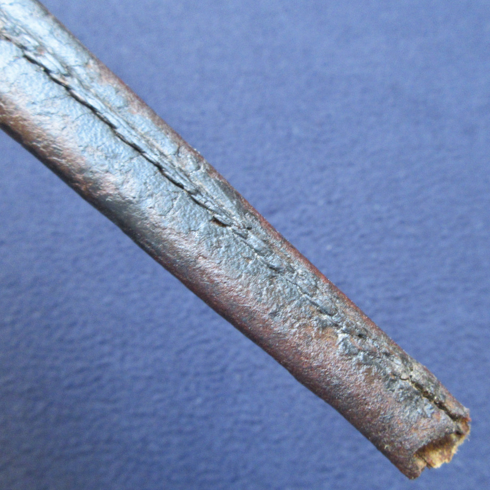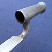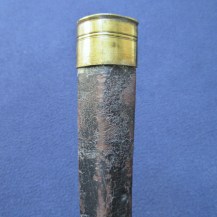 The blade is stamped with the maker’s mark ‘S HILL’, indicating the manufacturer Stephen Hill, who traded from Pritchett Street in Birmingham from around 1830, then changed the trade name to S. Hill & Sons from 1849-1855, an inspection mark ‘D 4’, and the letter ‘F’ at the very base of the blade. The blade markings are partly worn: Indian socket bayonets were repolished often to keep them bright, which often resulted in the loss of detail to the markings. The rear rim of the socket is stamped with ‘6’ and four incised lines. The leather at the throat end is stamped with decorative criss-crossing lines.