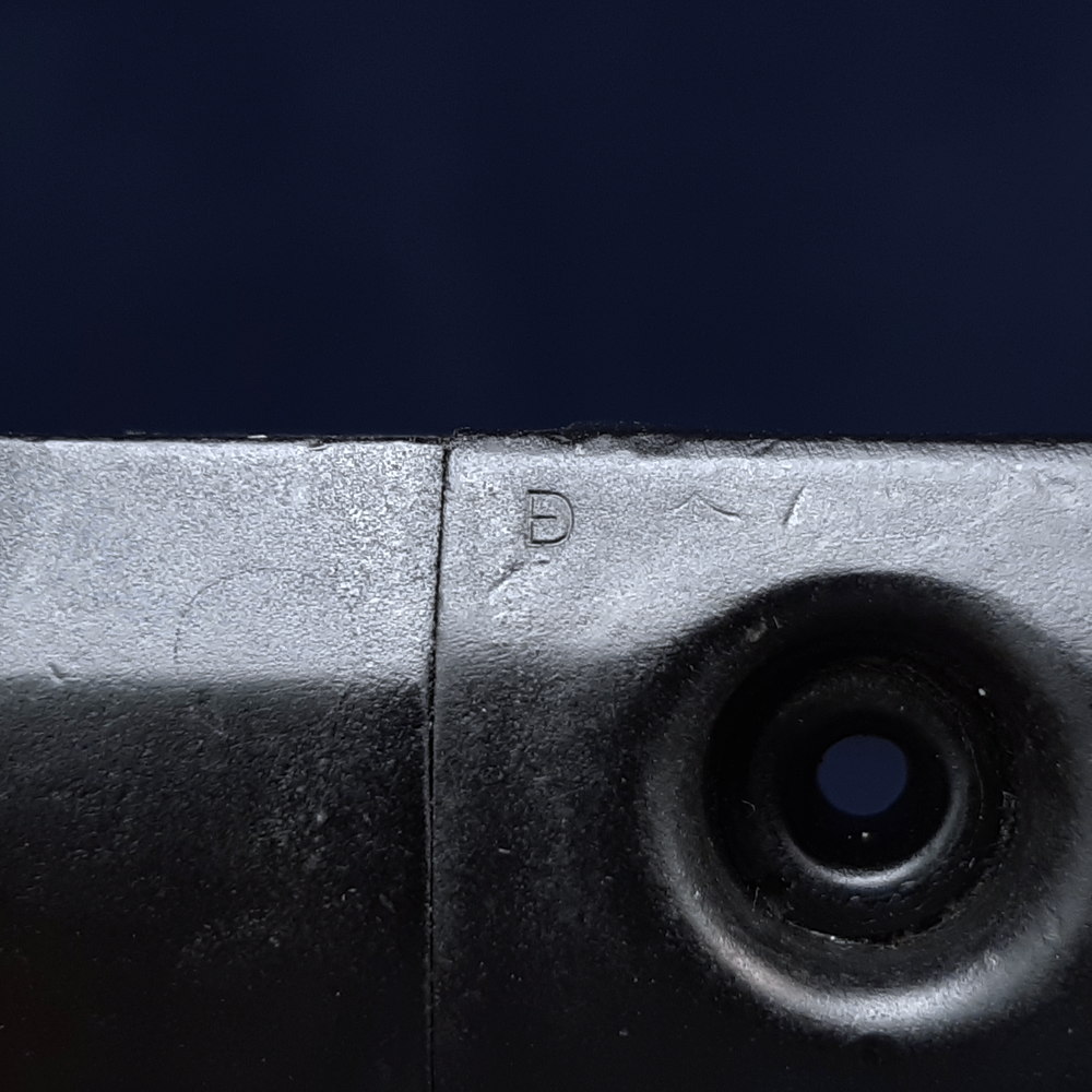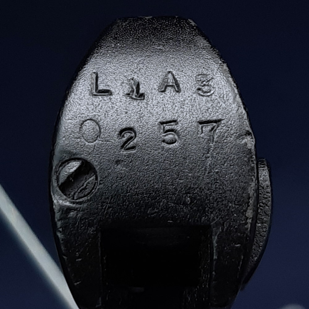Being dated 1957 this example is most likely one such conversion of an L1A1. Its markings also show signs of conversion: the grips of either an L1A1 or L1A3 would normally be stamped with their model and NATO item number, but these would be incorrect after conversion and I think they have been deliberately removed on this example by grinding, and only new Enfield ‘D’ stamps were applied before the grips were refinished. The new model mark ‘L1A3’ was then applied by manual stamping on the pommel rather than trying to replace the factory stamping on the grips.