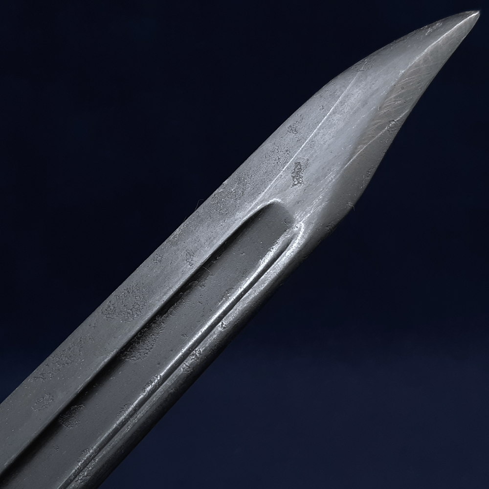 The blade retains its black parkerised finish with only tiny bright spots of wear on raised edges. Some dimpled forging imperfections to the blade which have been parkerised over. Likewise some spots of wear to the finish on raised edges of the hilt, grips and pommel, a couple of very small chips to the scabbard with light rubbing at its chape end.