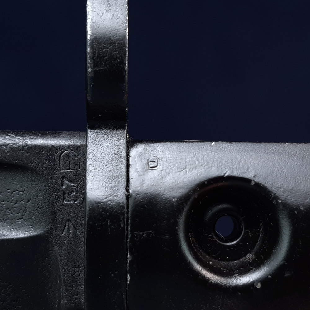 The grip slabs are each stamped with another ‘D’ with a stroke Enfield stamp and another broad arrow. The pommel is stamped on its base with the model ‘L1A3’, as well as with ‘0’ and ‘257’, the latter probably a serial or weapon number.