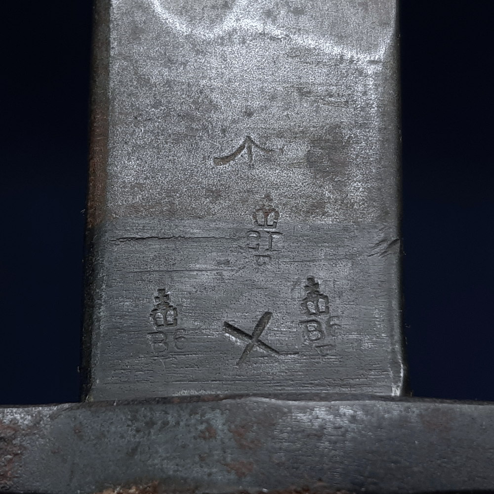 The ricasso is stamped on one side with a crown, 1907 (the pattern) ‘9 17’, indicating the manufacture date of September 1917, the manufacturer’s mark ‘SANDERSON’, four crown inspection stamps (three with ‘E’ indicating the Royal Small Arms Factory at Enfield), and multiple reissue stamps dated ’27, ’31 and ’39. On the other side it is stamped with a ‘broad arrow’ War Department stores mark, three more crown inspection stamps with ‘E’, and an ‘X’ indicating that it passed a manufacturer’s bending test.