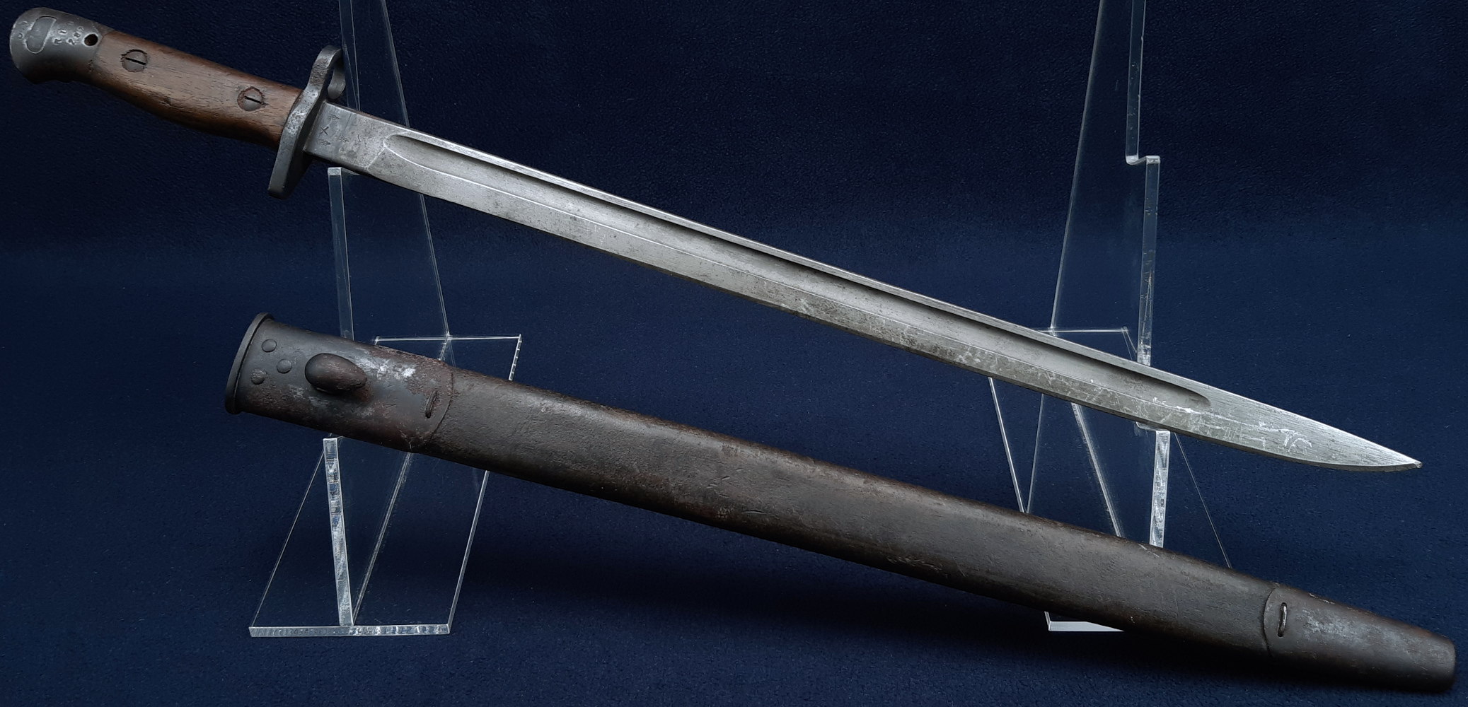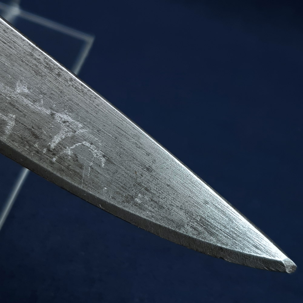 The blade has a matt parkerised finish with streaks of rubbing, some scratches and spots of light patination. Some small nicks to the sharpened edge near the tip, the tip rounded. The blued band at the shoulder of the blade is intact. The hilt, pommel and scabbard fittings are blued with some light rubbing on raised edges, but have also been impacted by rust leading to areas of moderate to heavy pitting and encrustation, the latter most notable on the throat piece of the scabbard. While this is removable by polishing, that would also remove the remaining blueing. Only a few small dents to the wood grips. The leather scabbard body has some light dents and surface abrasion. All the scabbard’s stitching remains intact.